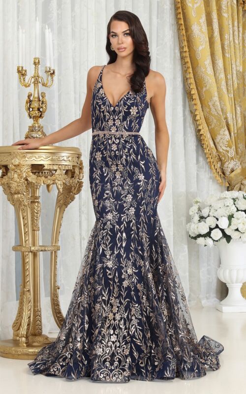 Navy Gold Elegant Series Long Dress with Gold Flower Detail