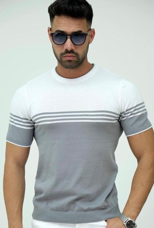 Crew Neck Three Stripe Detailed Gray Knitted Fabric T-Shirt