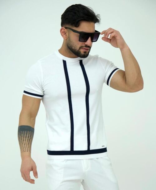 Crew Neck White Black Vertical Line Patterned Knitted Fabric T-Shirt