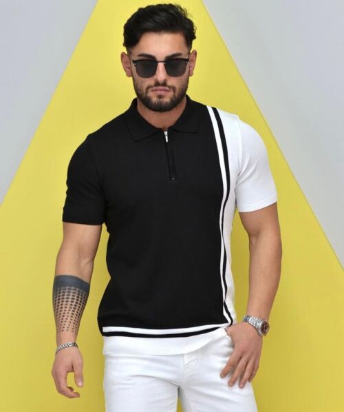 Polo Neck Half Zipper Black Extra Garnished Knitted Fabric T-Shirt