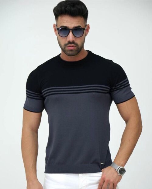 Crew Neck Three Stripe Detailed Dark Grey Knitted Fabric T-Shirt