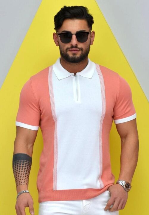Polo Neck Half Zipper Pink Knitted Fabric T-Shirt