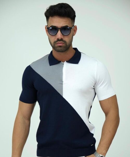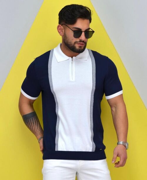 Polo Neck Half Zipper Navy Knitted Fabric T-Shirt