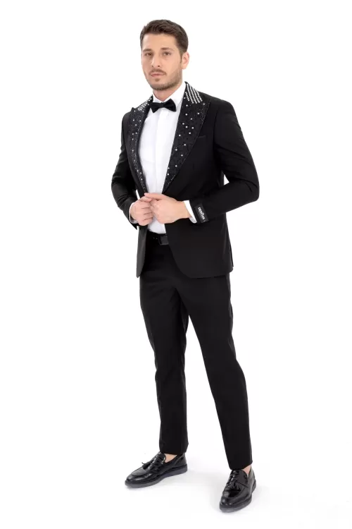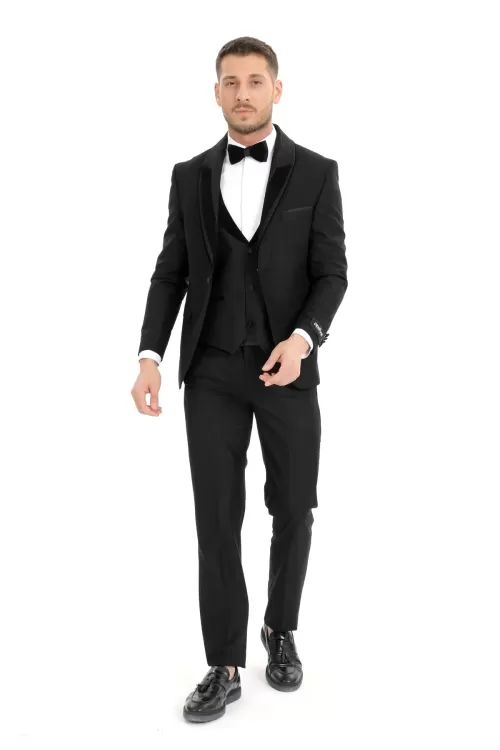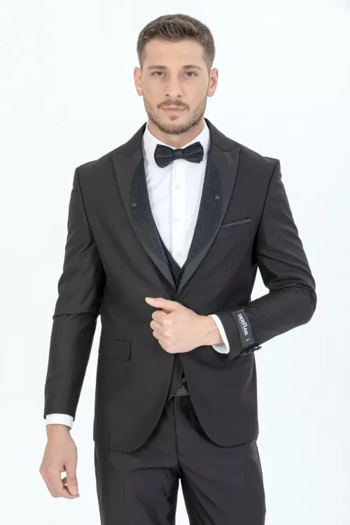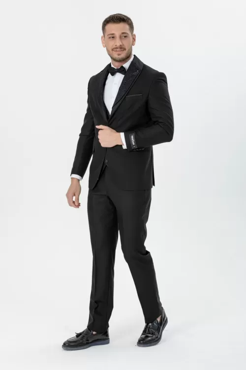 Black Silvery Detailed Collar Luxury Tuxedo Three Piece Set