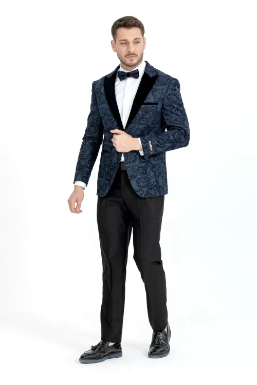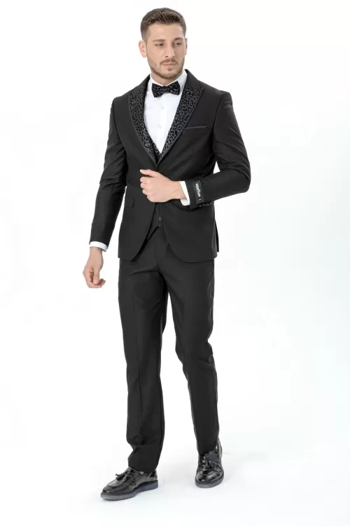 Black Luxury Patterned Collar Tuxedo Three Piece Set