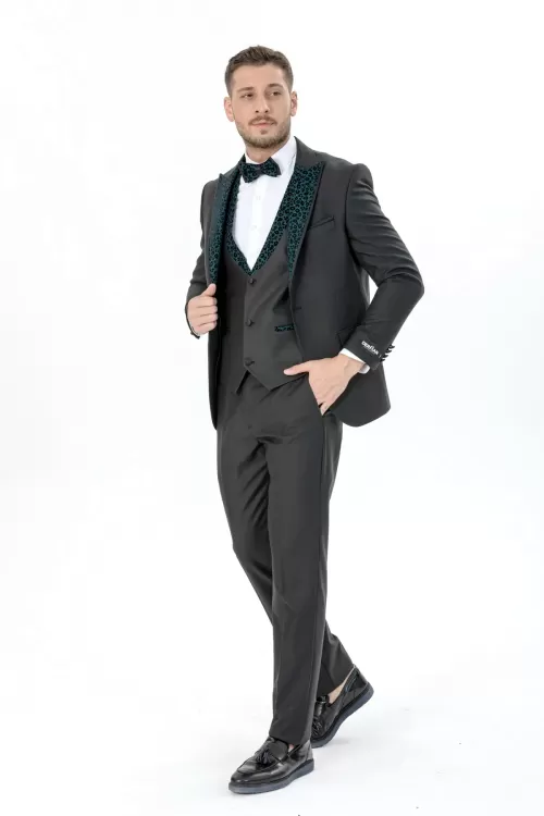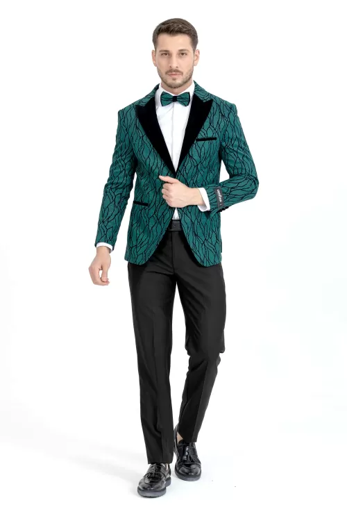 Green Luxury Patterned Collar Tuxedo Three Piece Set