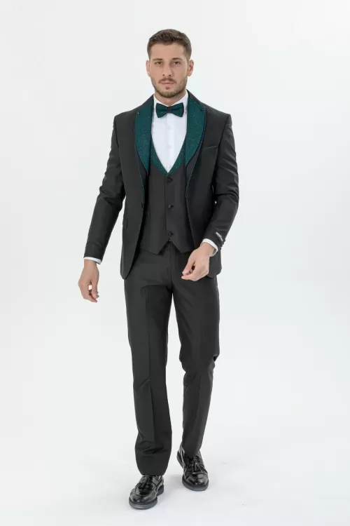 Green Silvery Collar Luxury Tuxedo Three Piece Set