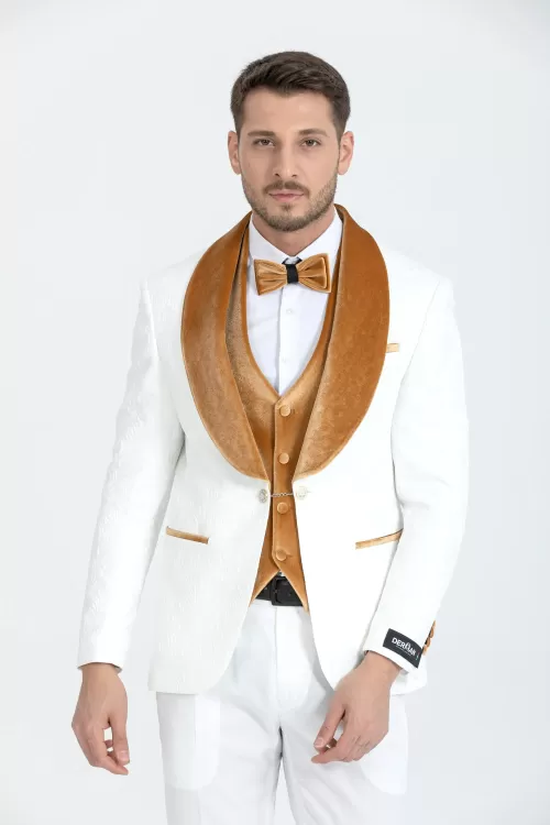Gold Luxury Floral Textured Velvet Collar Three Piece Tuxedo