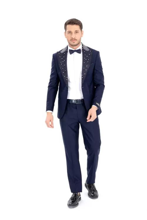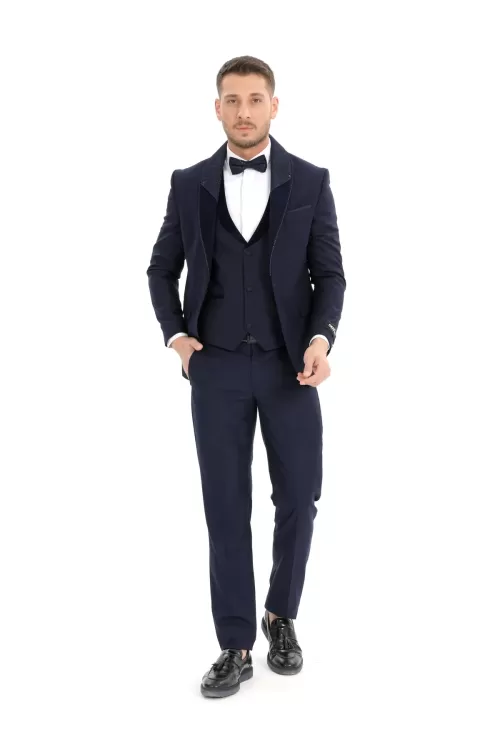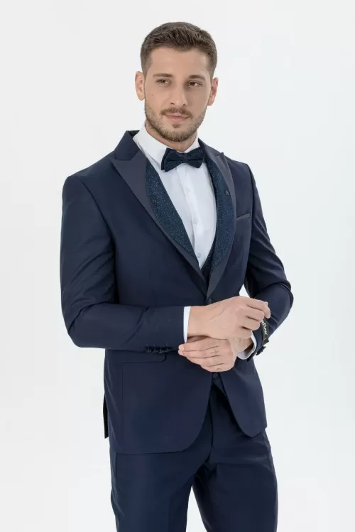 Navy Luxury Patterned Collar Tuxedo Three Piece Set
