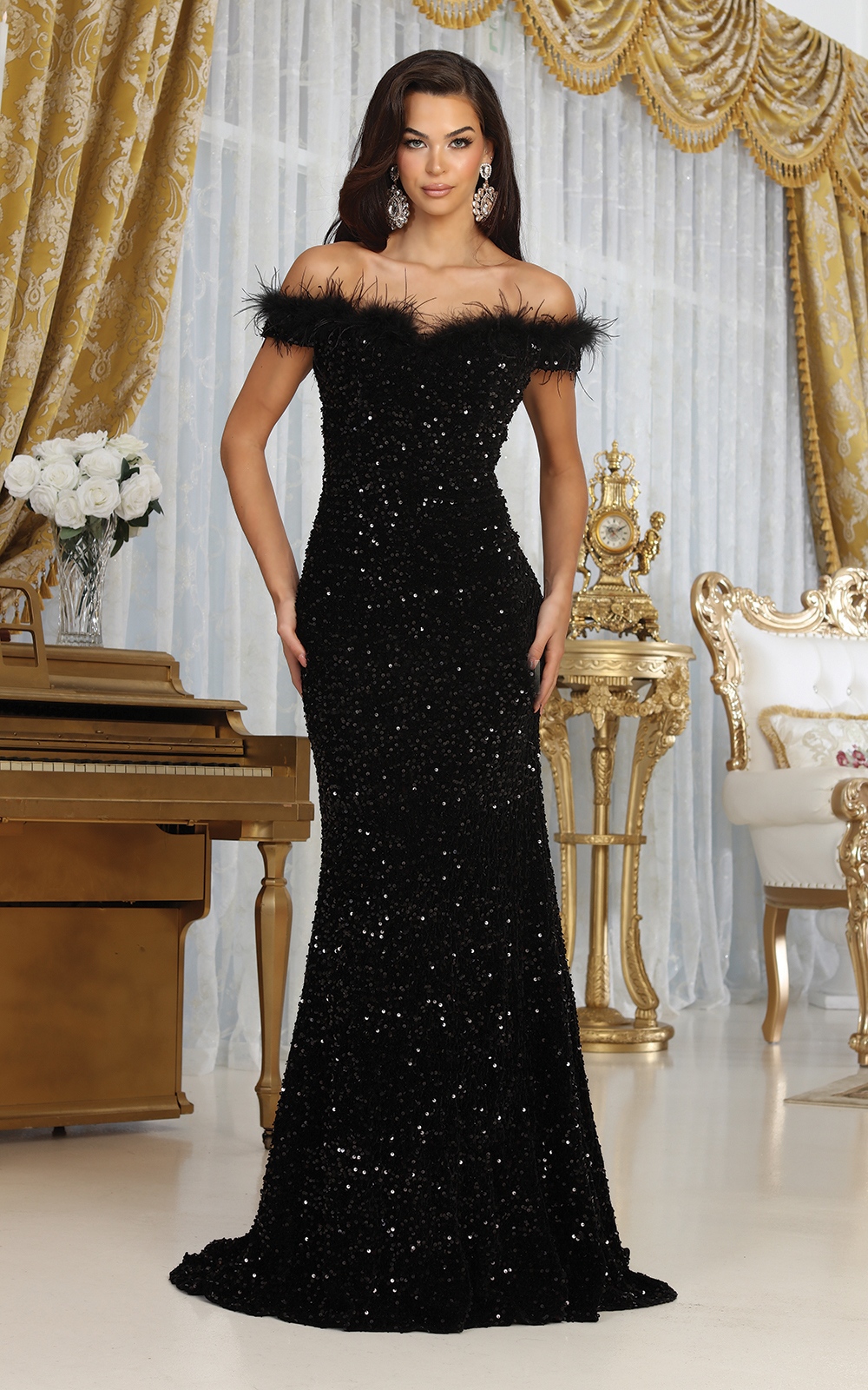 Black Off Shoulder Long Evening Dress with Glitter Detail