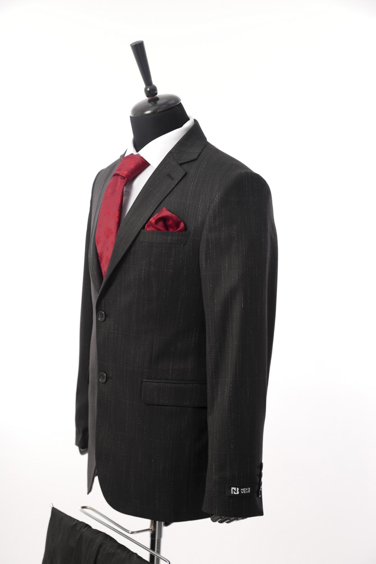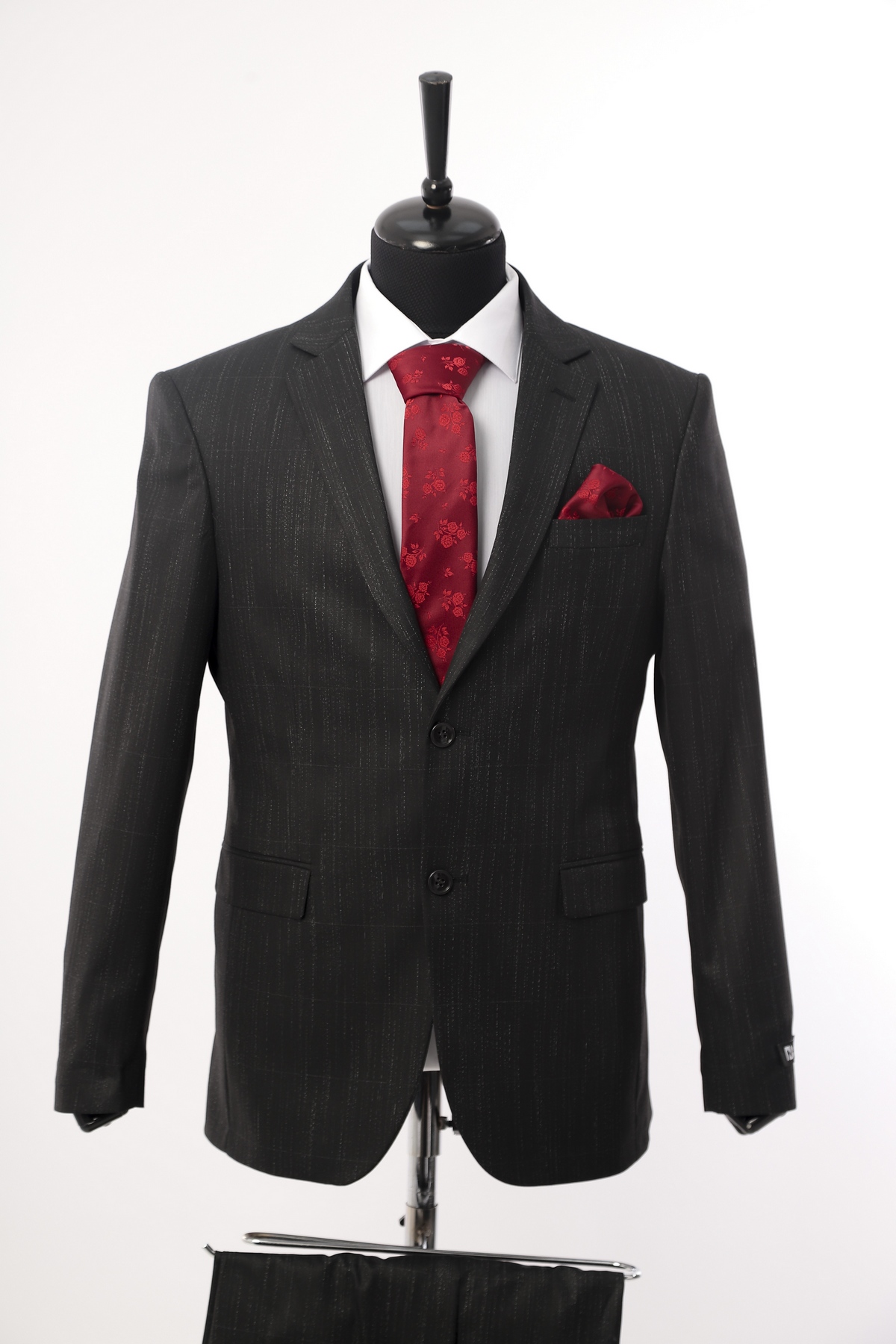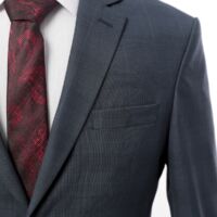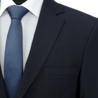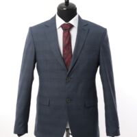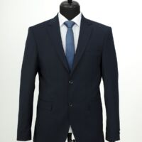 Wool fabric , slim fit suit. Classic cut pants and suit jacket with two flap pockets and one inserted chest pocket. Two button closure and two slits in back.