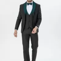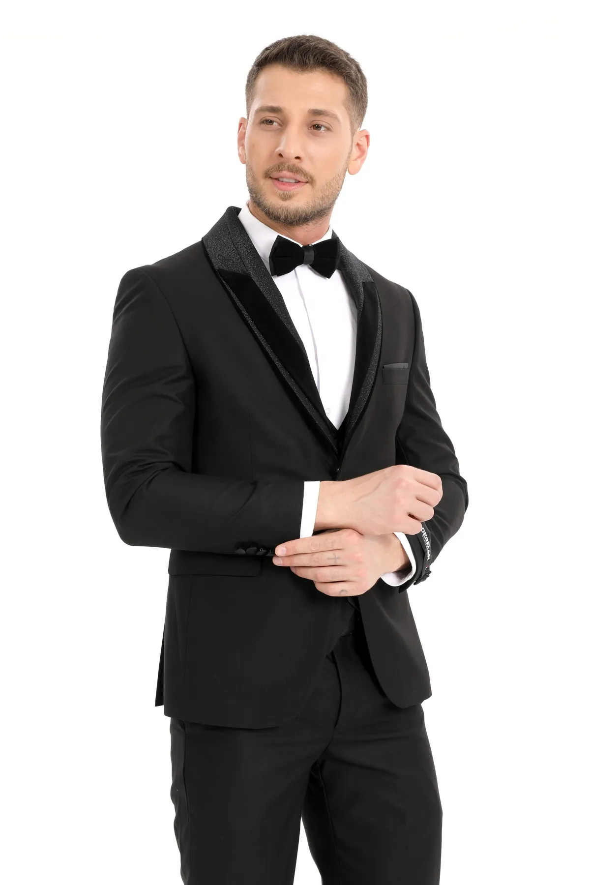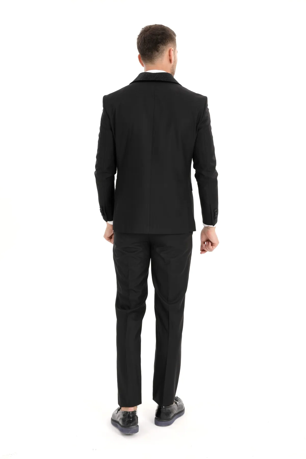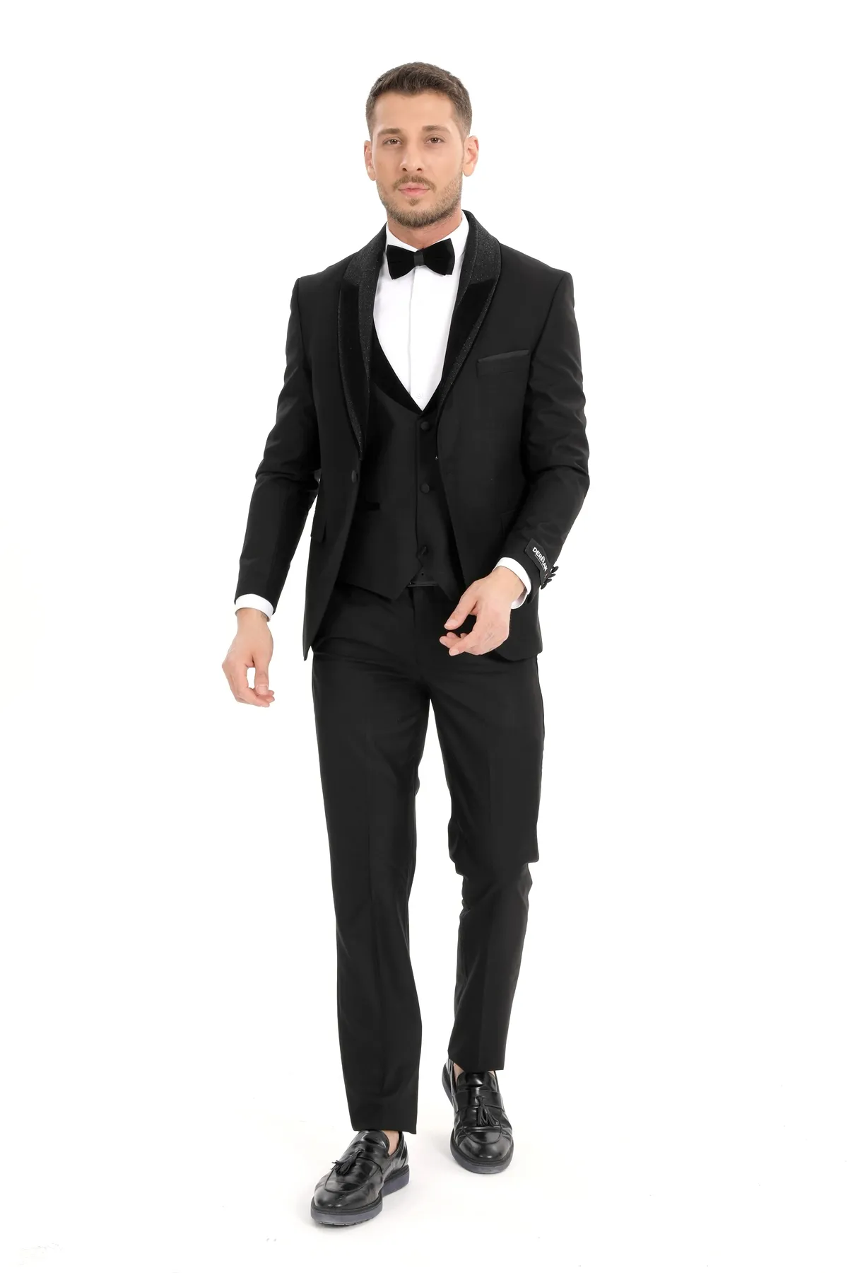 Black Silvery Collar Luxury Tuxedo Three Piece Set