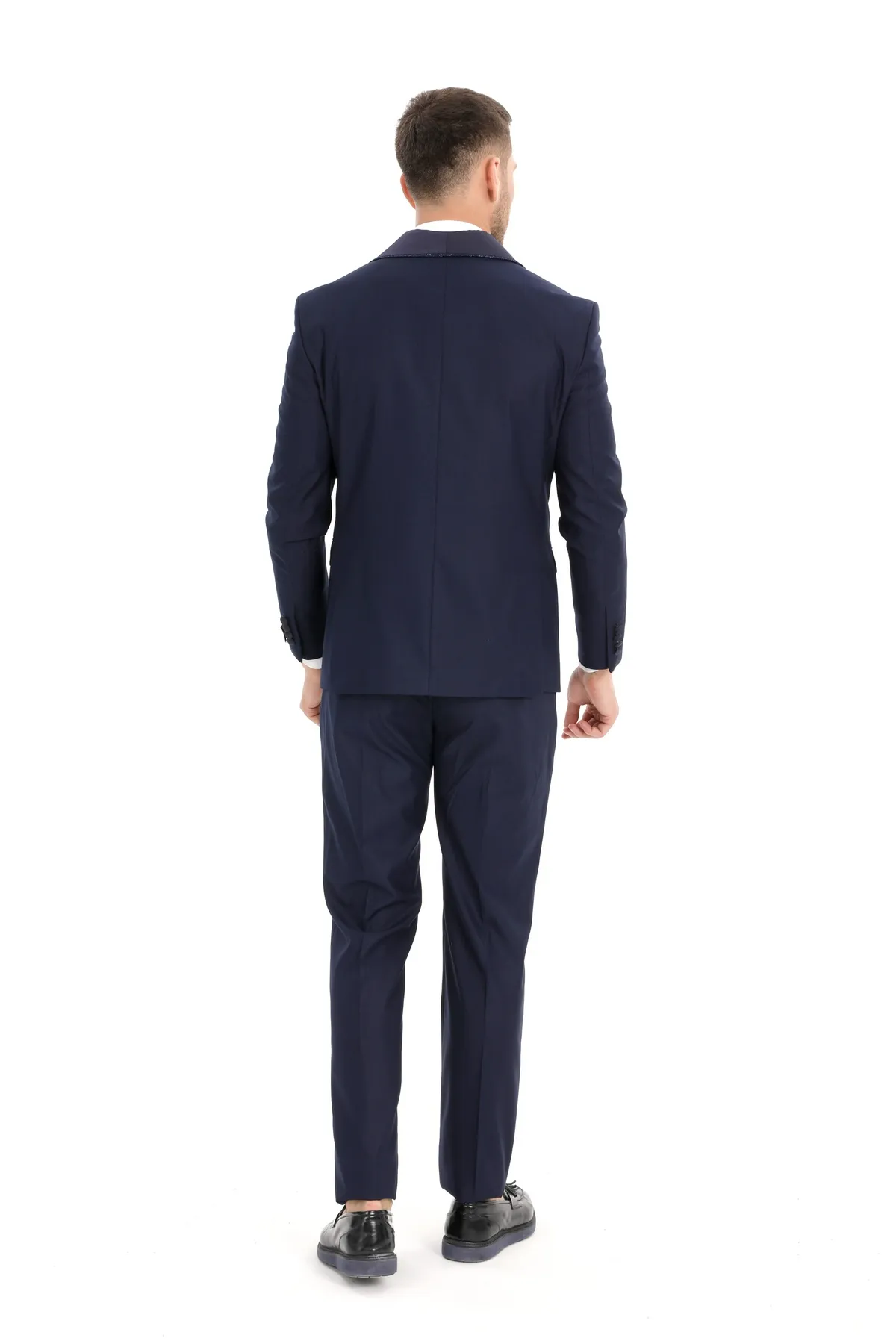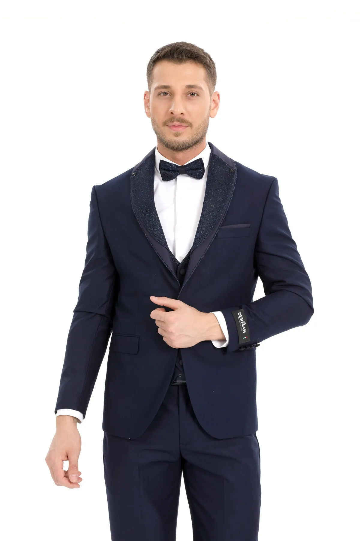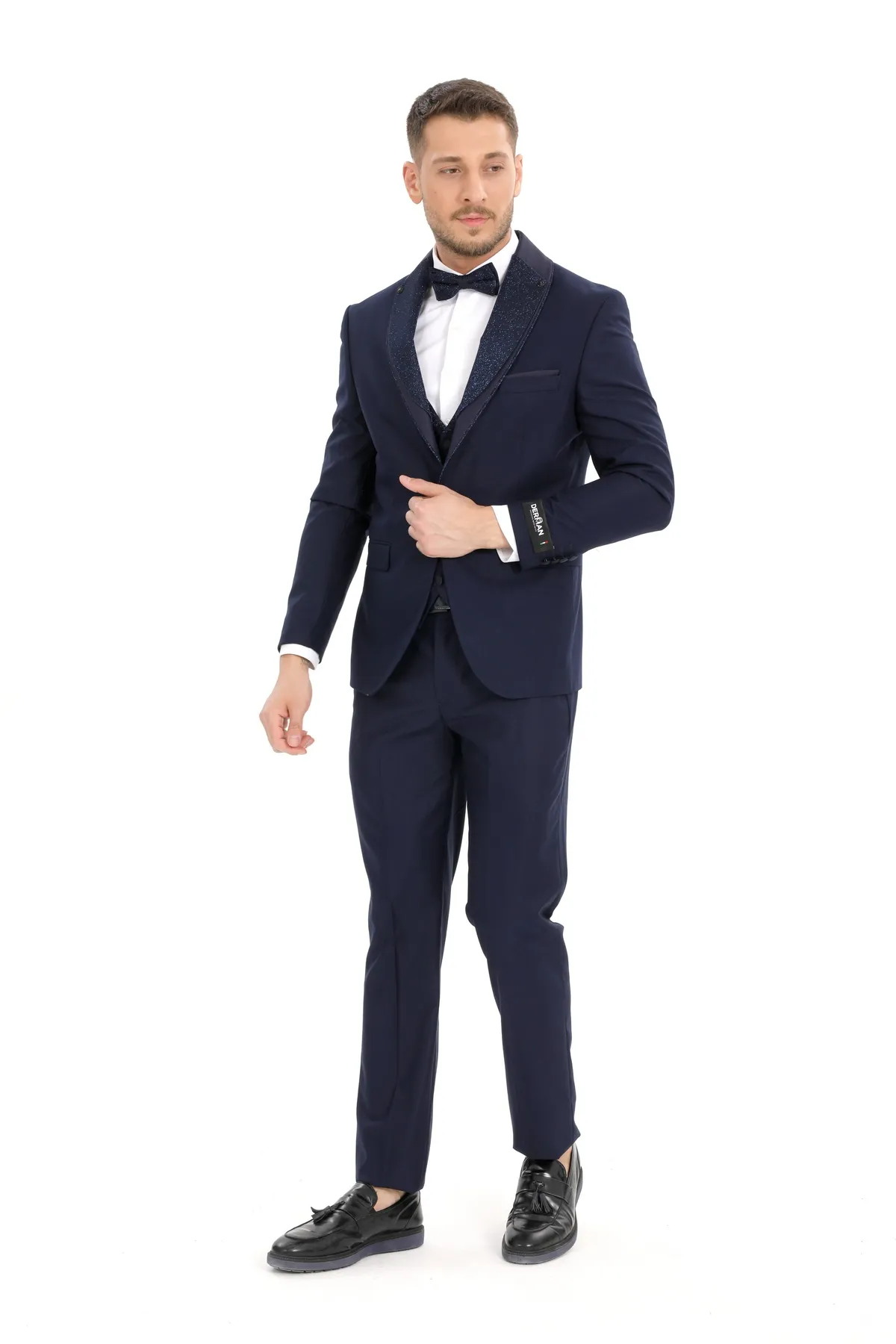 Black Silvery Detailed Collar Luxury Tuxedo Three Piece Set