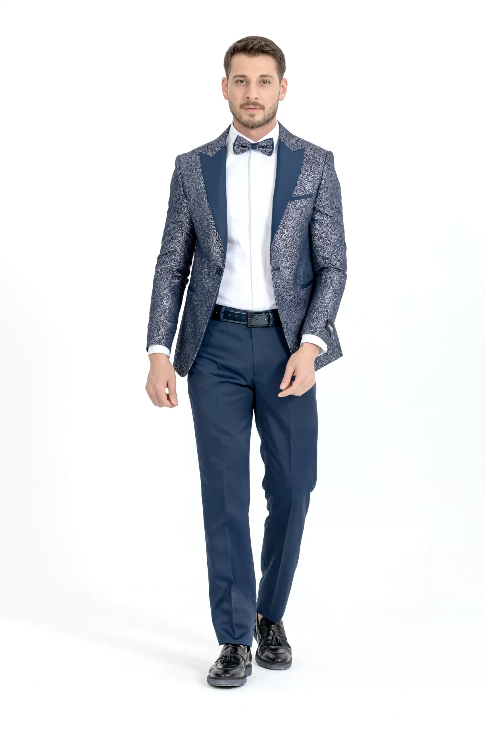 Blue Floral Patterned Textured Tuxedo Two Piece Set
