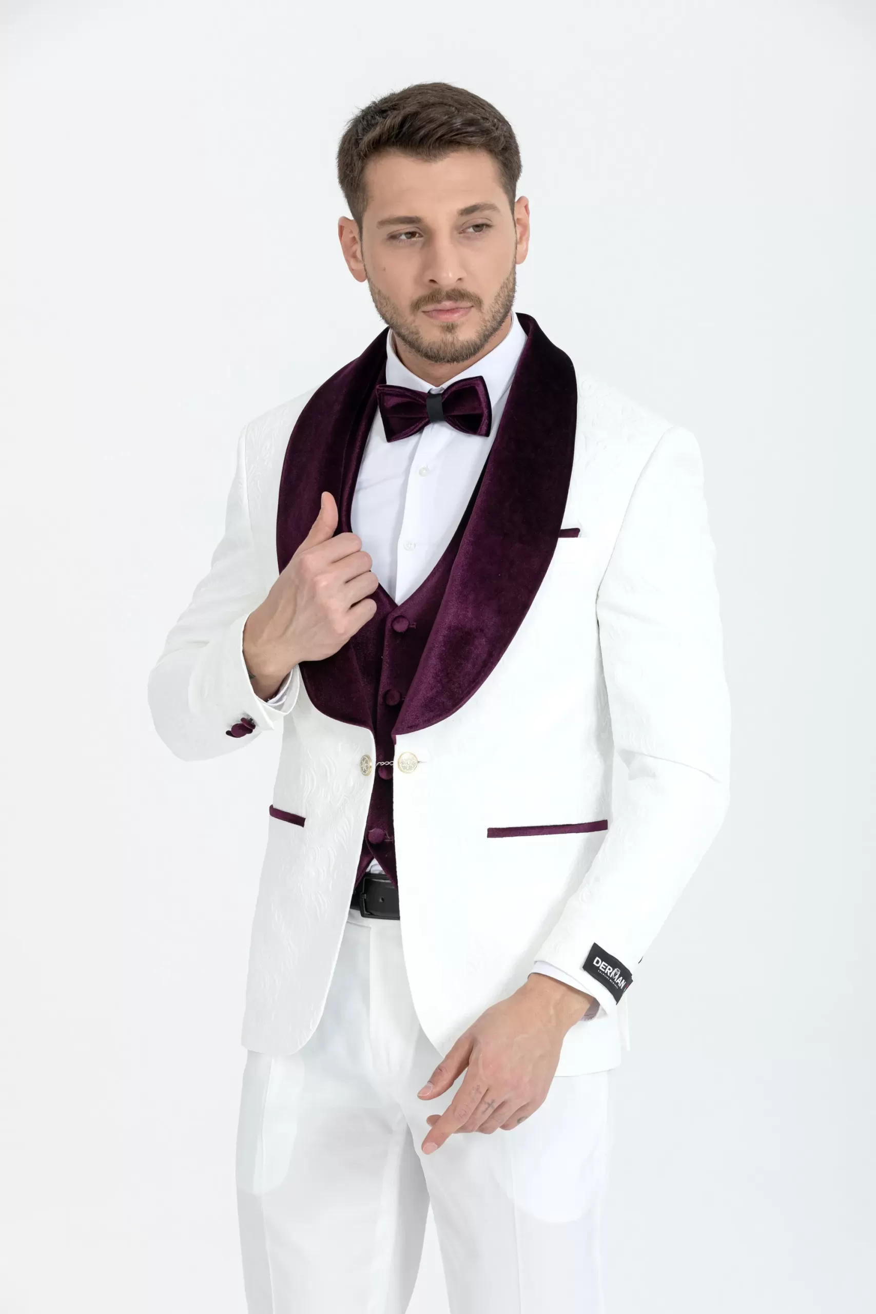 Burgundy Luxury Floral Textured Velvet Collar Three Piece Tuxedo