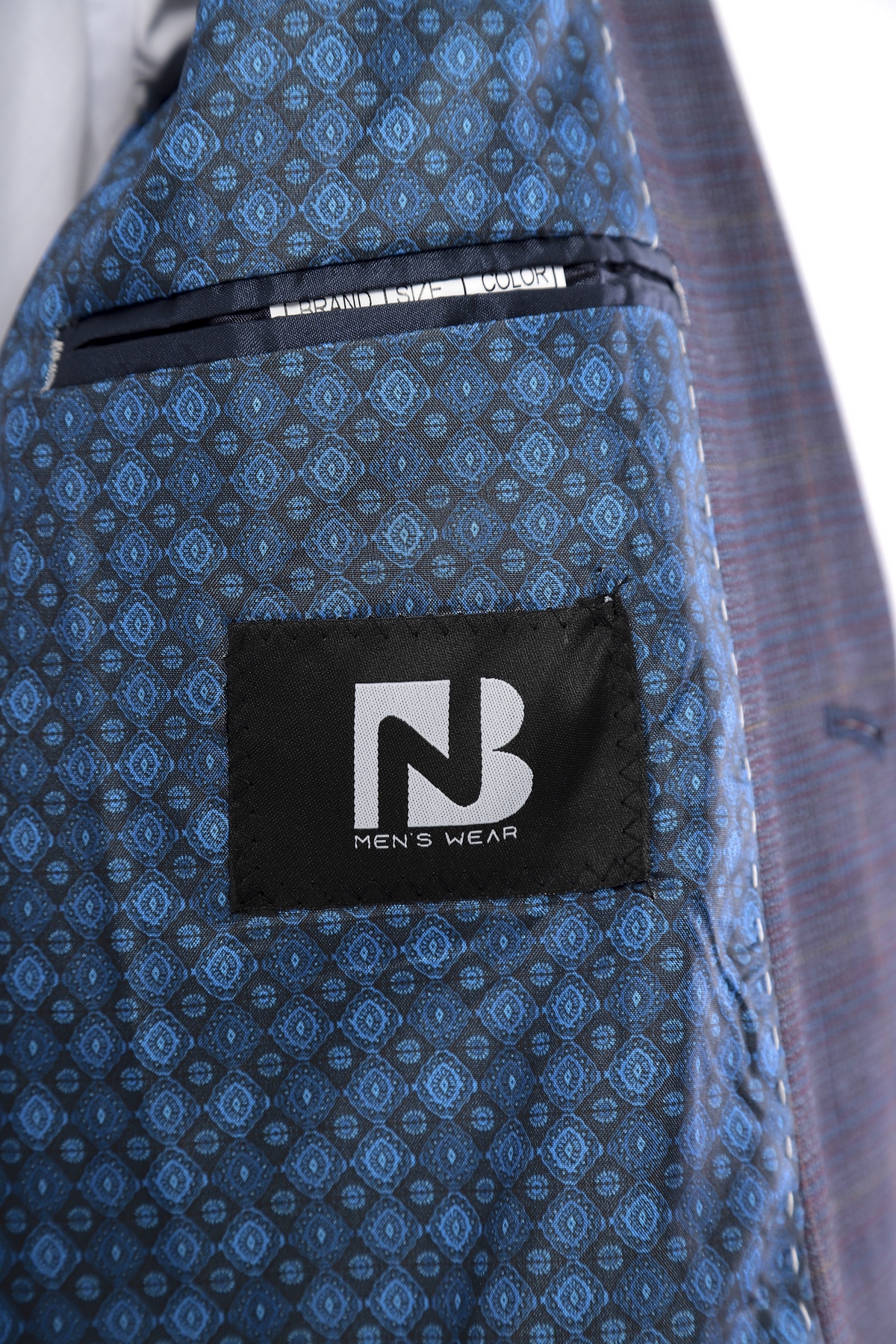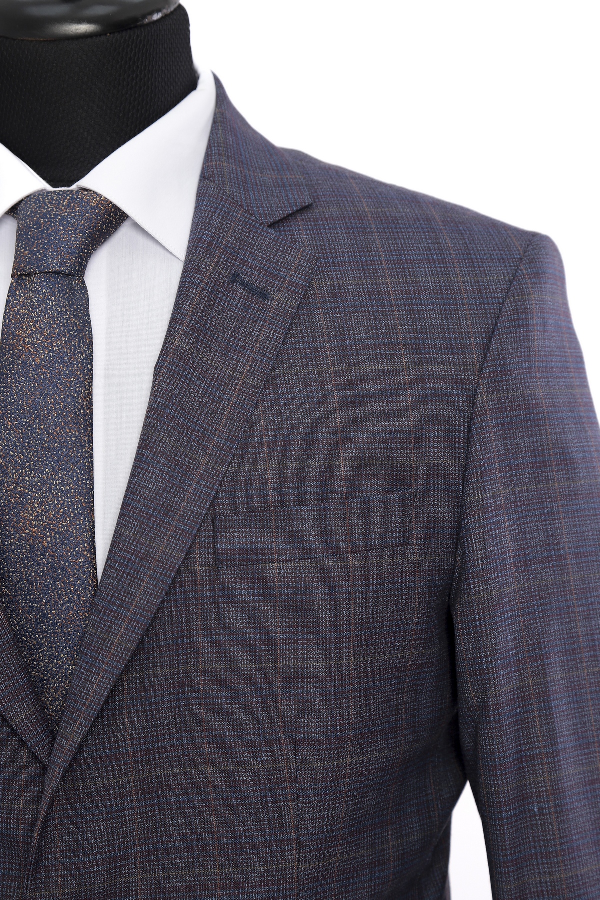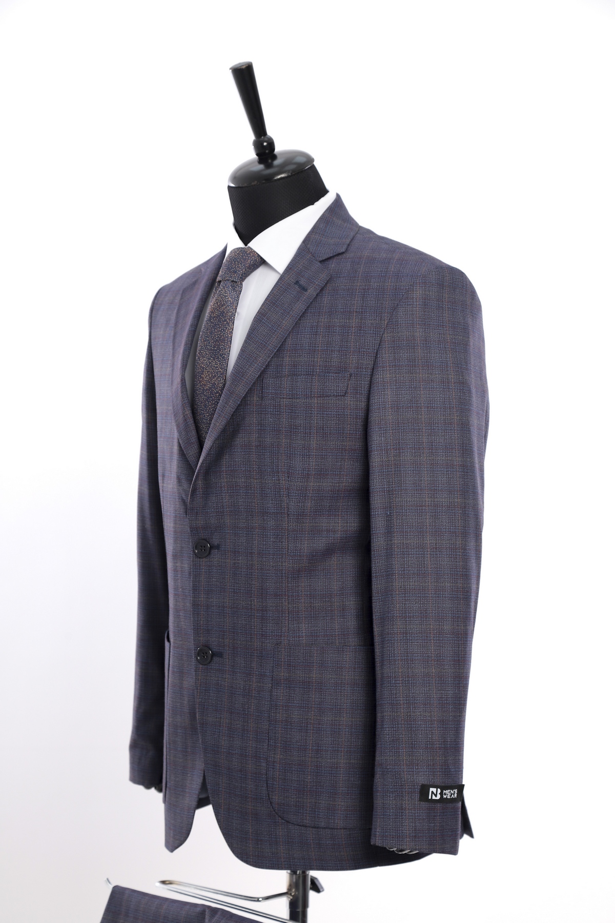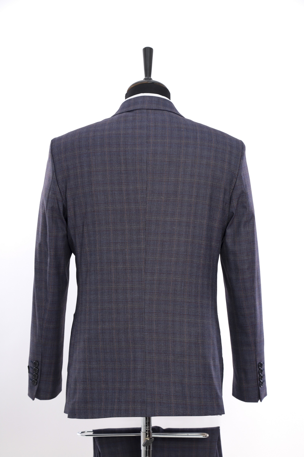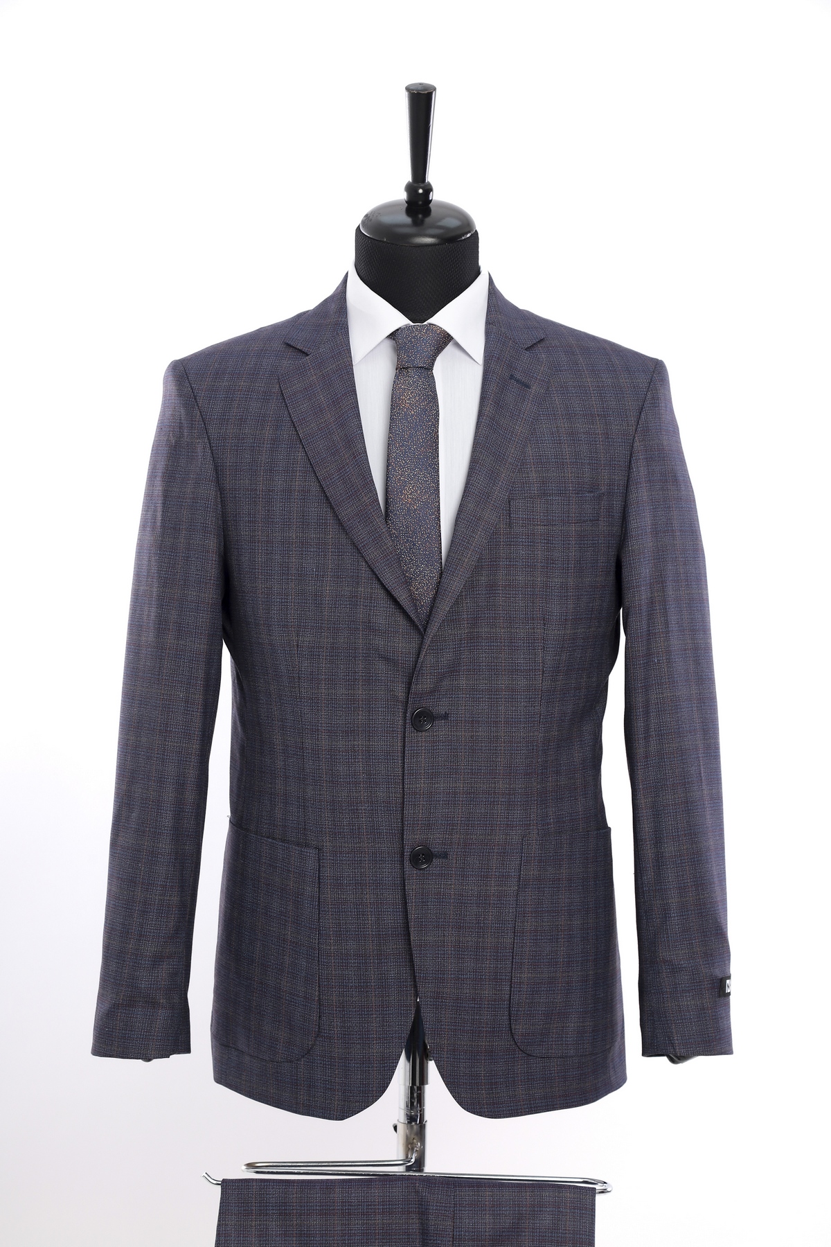 Wool fabric , slim fit suit. Classic cut pants and suit jacket with two flap pockets and one inserted chest pocket. Two button closure and two slits in back.
