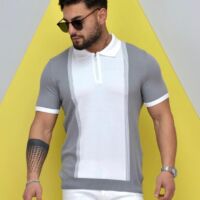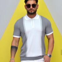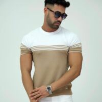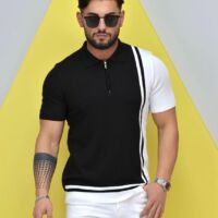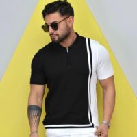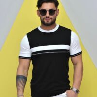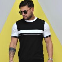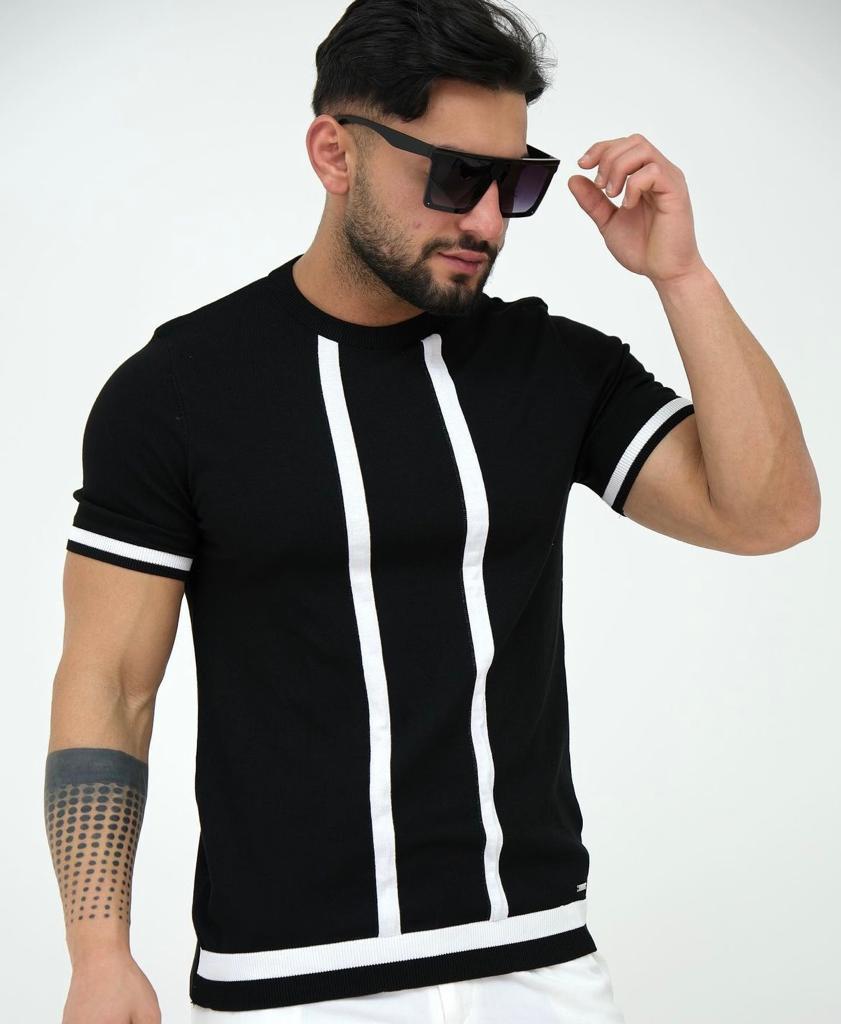 Crew Neck Black Vertical Line Patterned Knitted Fabric T-Shirt