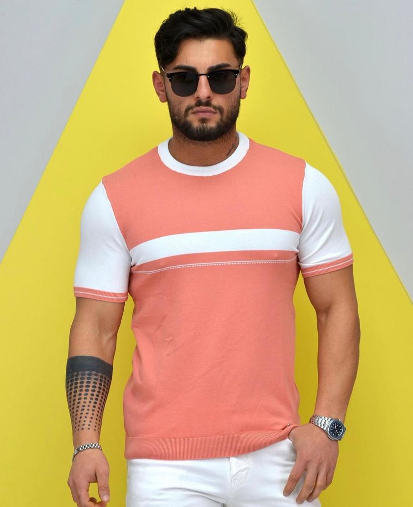 Crew Neck Pink Knitted Fabric White Stripe Detailed T-Shirt