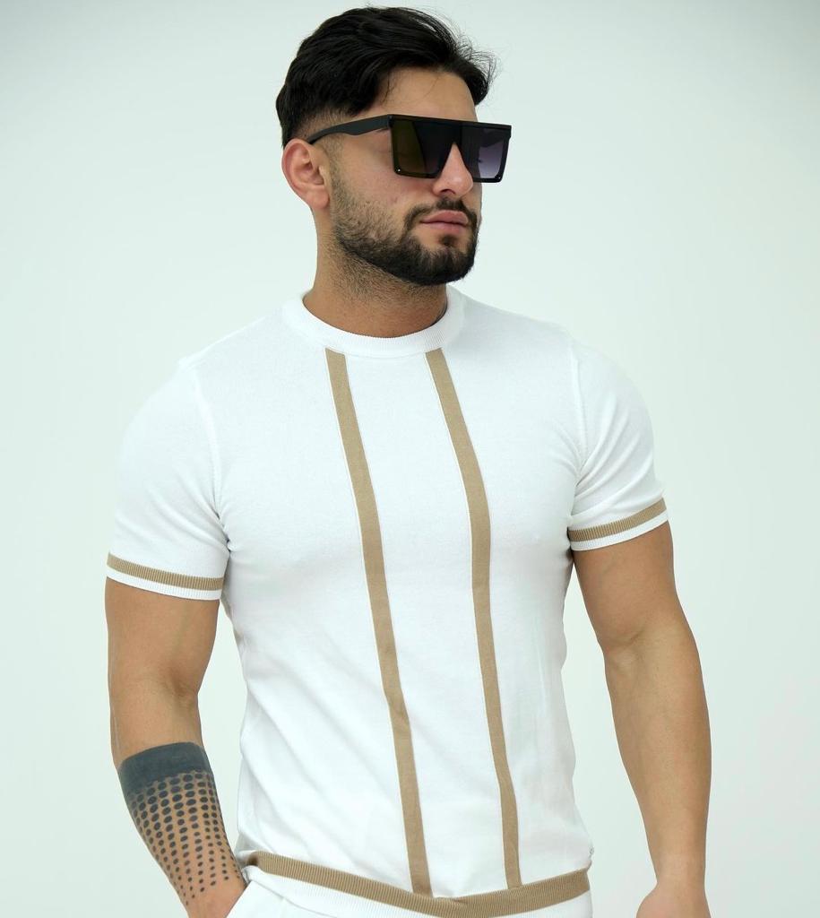 Crew Neck White Beige Vertical Line Patterned Knitted Fabric T-Shirt