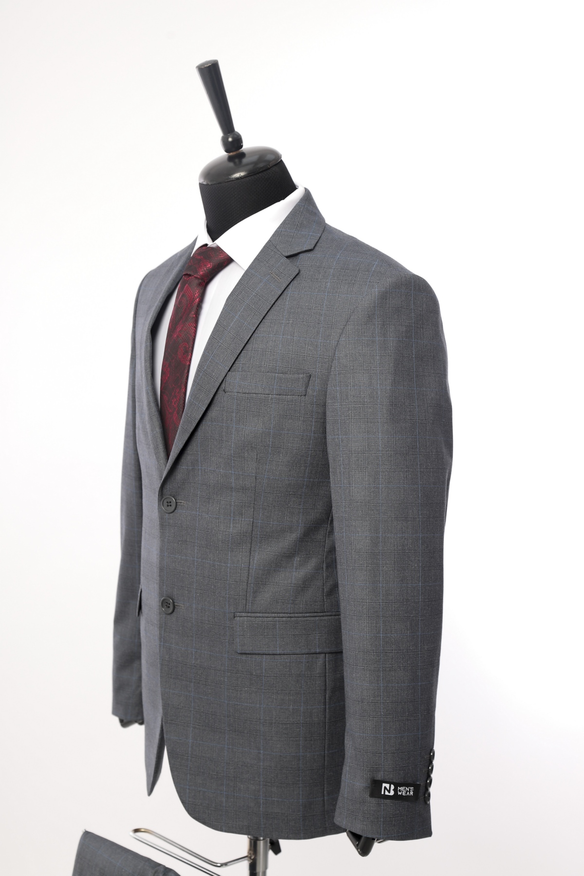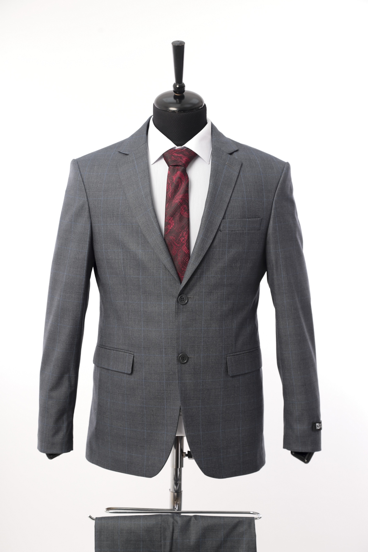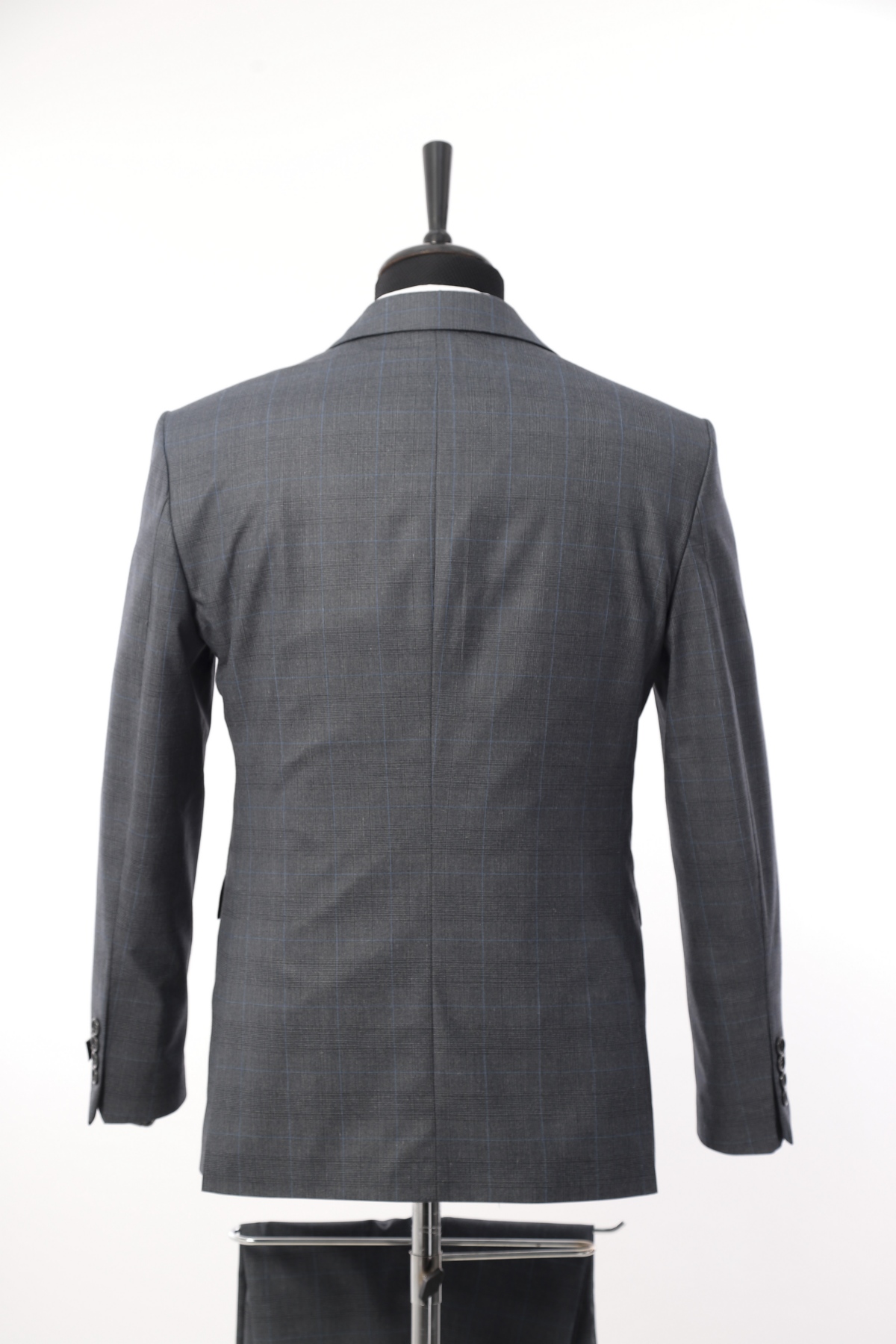 Wool fabric , slim fit suit. Classic cut pants and suit jacket with two flap pockets and one inserted chest pocket. Two button closure and two slits in back.