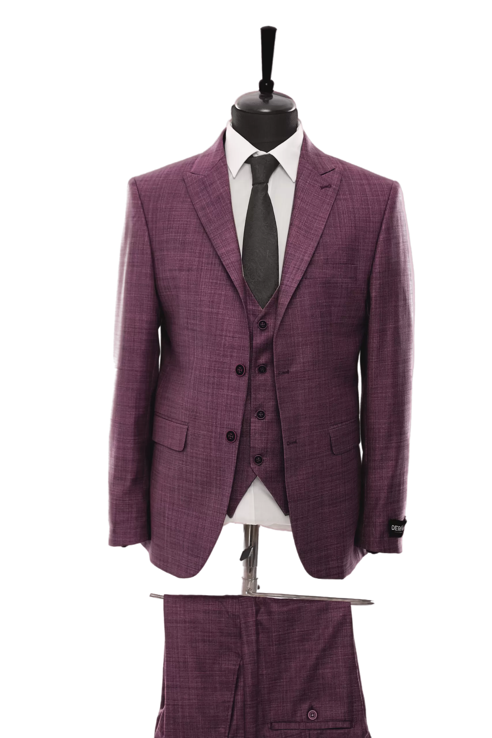 Express yourself with the classic royal trio, another magnificent design by Derman. Complete with a double-breasted round cut vest, this three-piece is perfect for a wedding or race day.