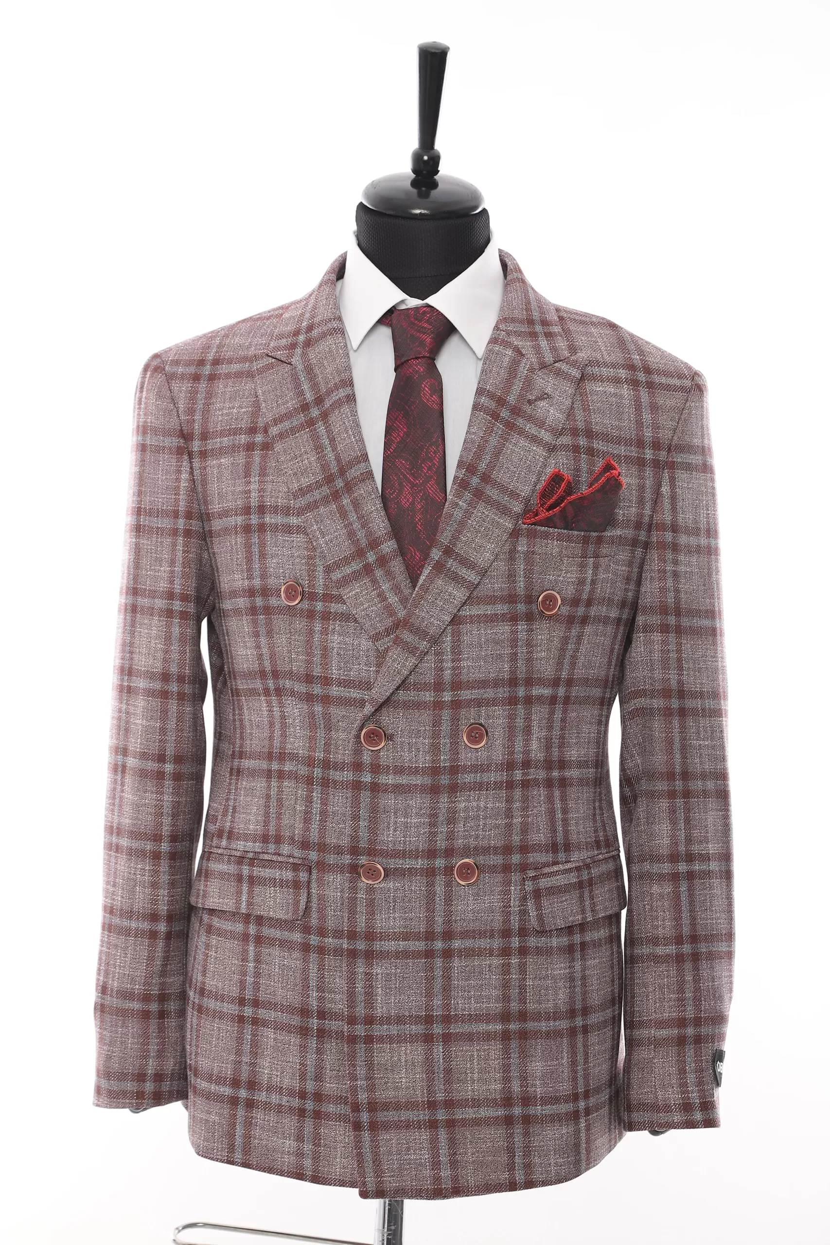 Features Double Breasted Burgundy Plaid Luxury Jacket