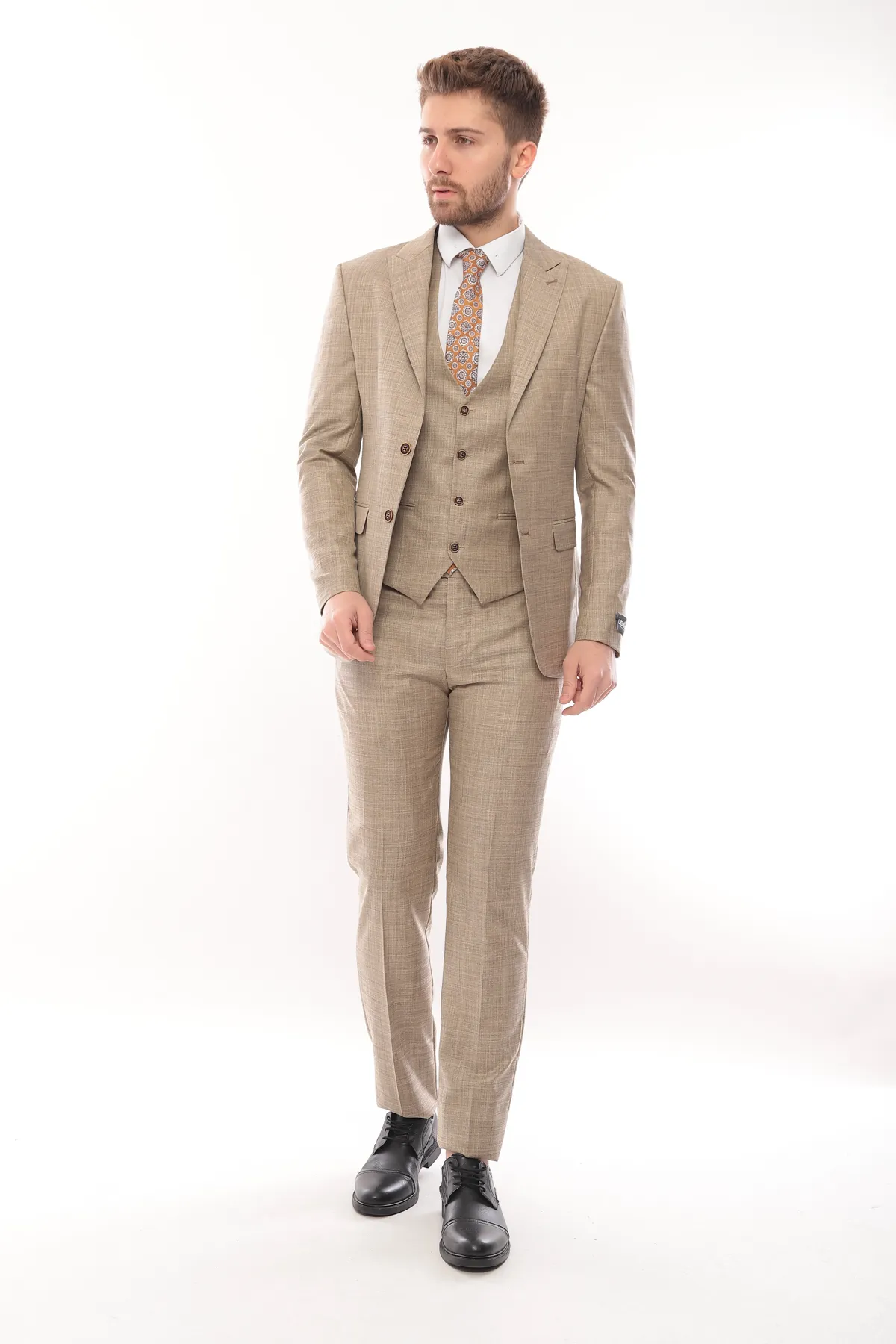 Double Breasted Ecru Patterned Fabric Three Piece Suit