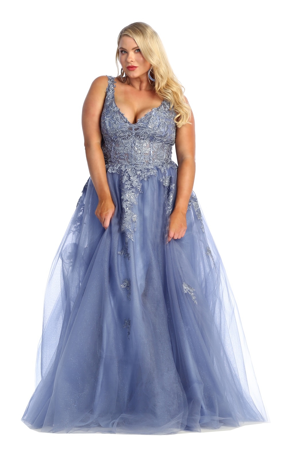 Dusty Blue Low-cut, High Slit Tulle Skirt Long Dress