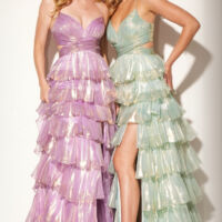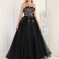 Dazzling custom embellishment throughout the fitted bodice gives this modest evening gown just enough sparkle to shine on any occasion.