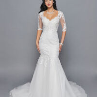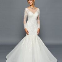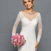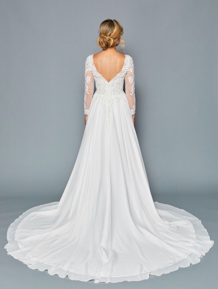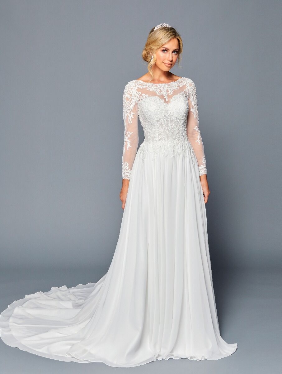 ELEGANT BOAT NECKLINE ILLUSION LONG SLEEVE CHIFFON A-LINE COURT TRAIN WEDDING DRESS WITH BEADED LACE APPLIQUE.