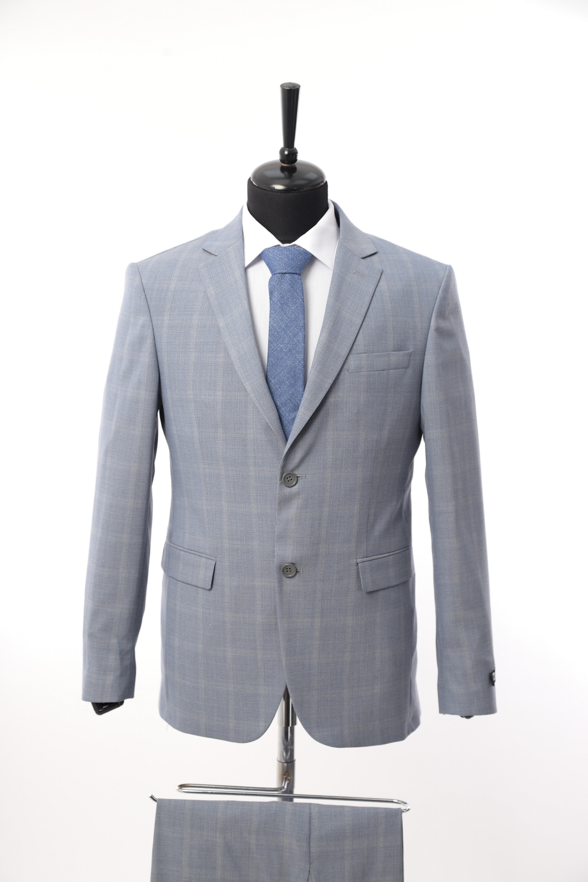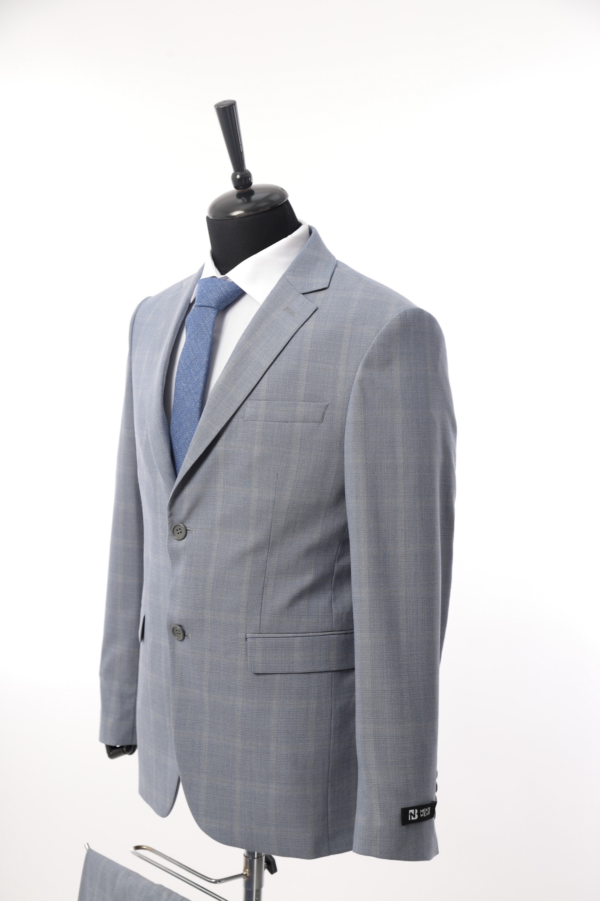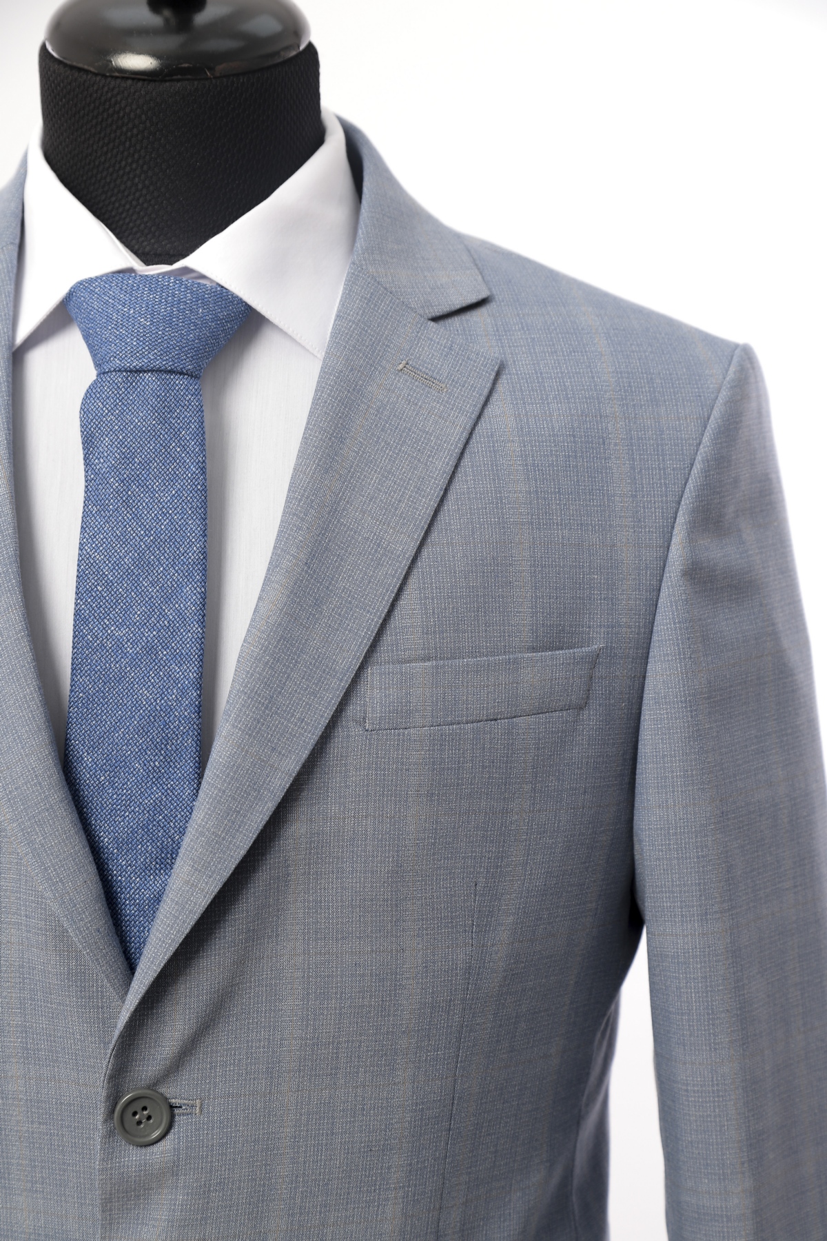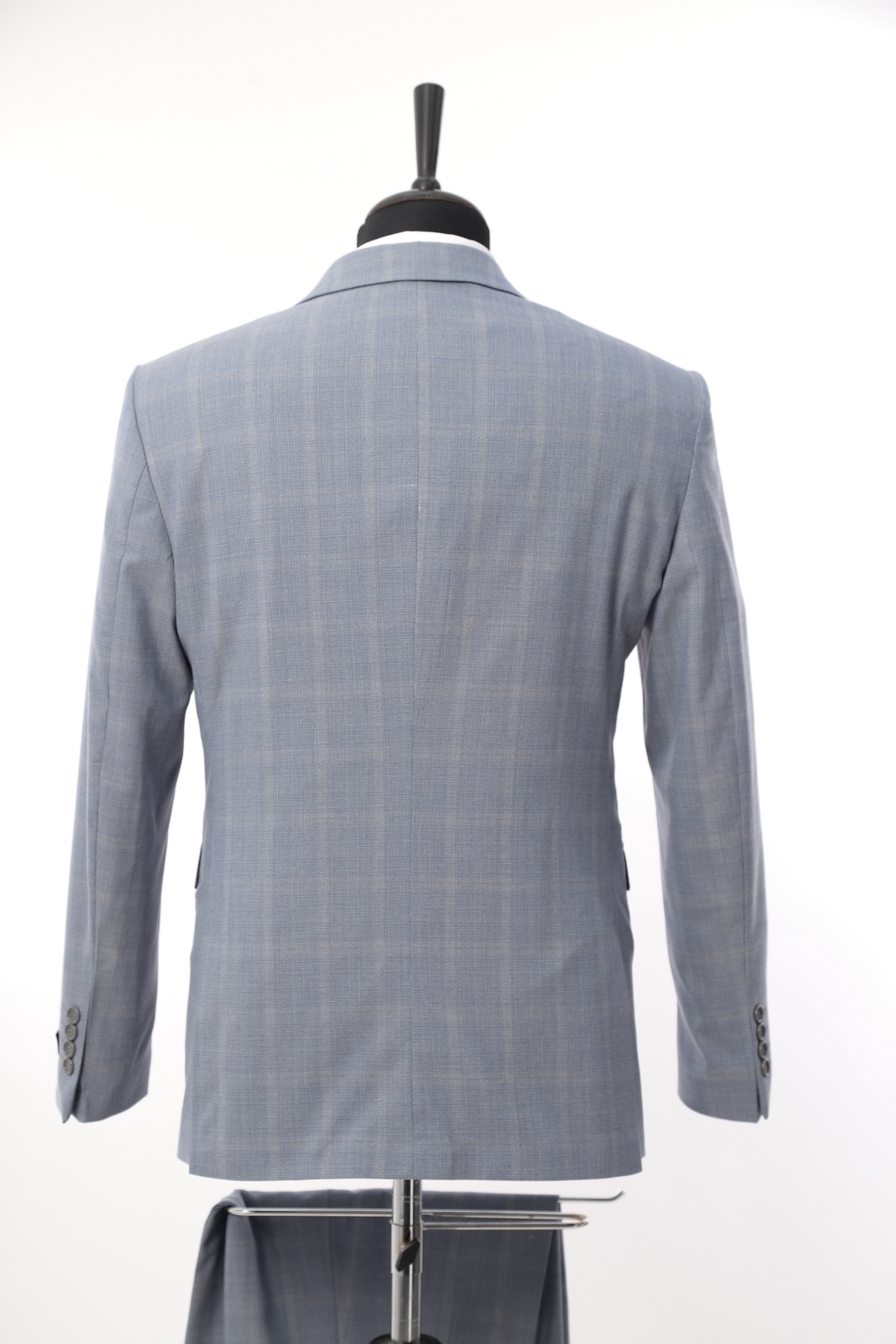 Wool fabric , slim fit suit. Classic cut pants and suit jacket with two flap pockets and one inserted chest pocket. Two button closure and two slits in back.