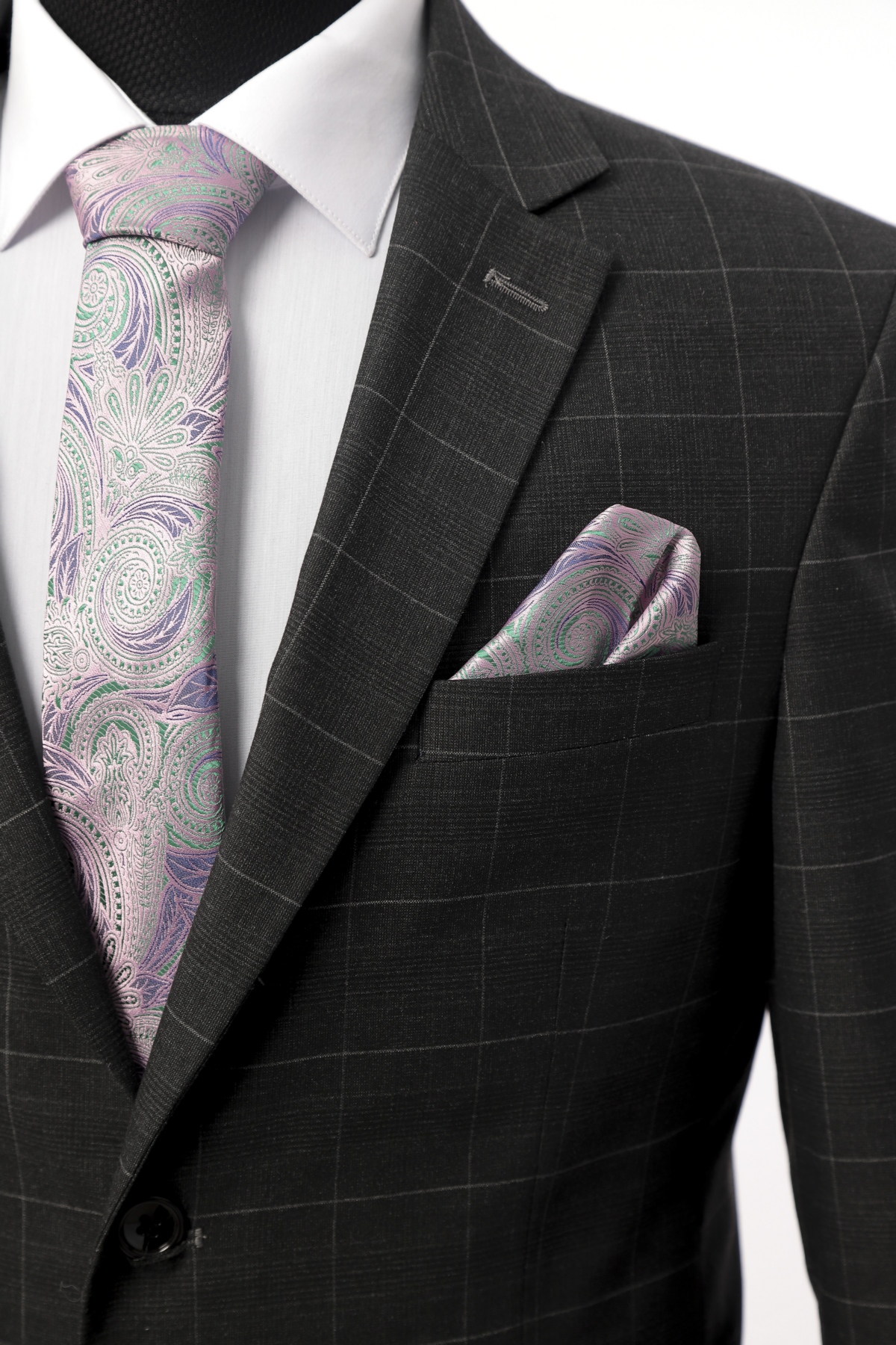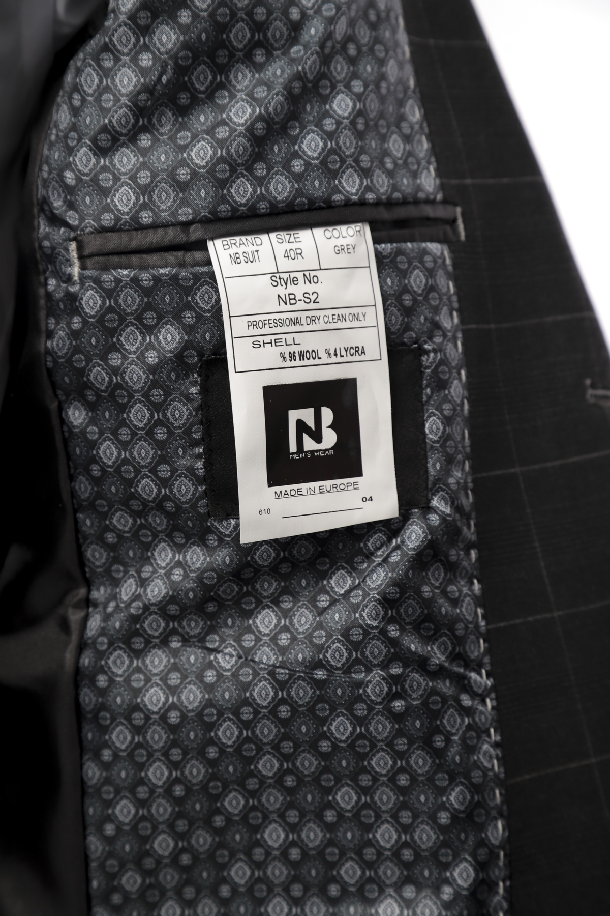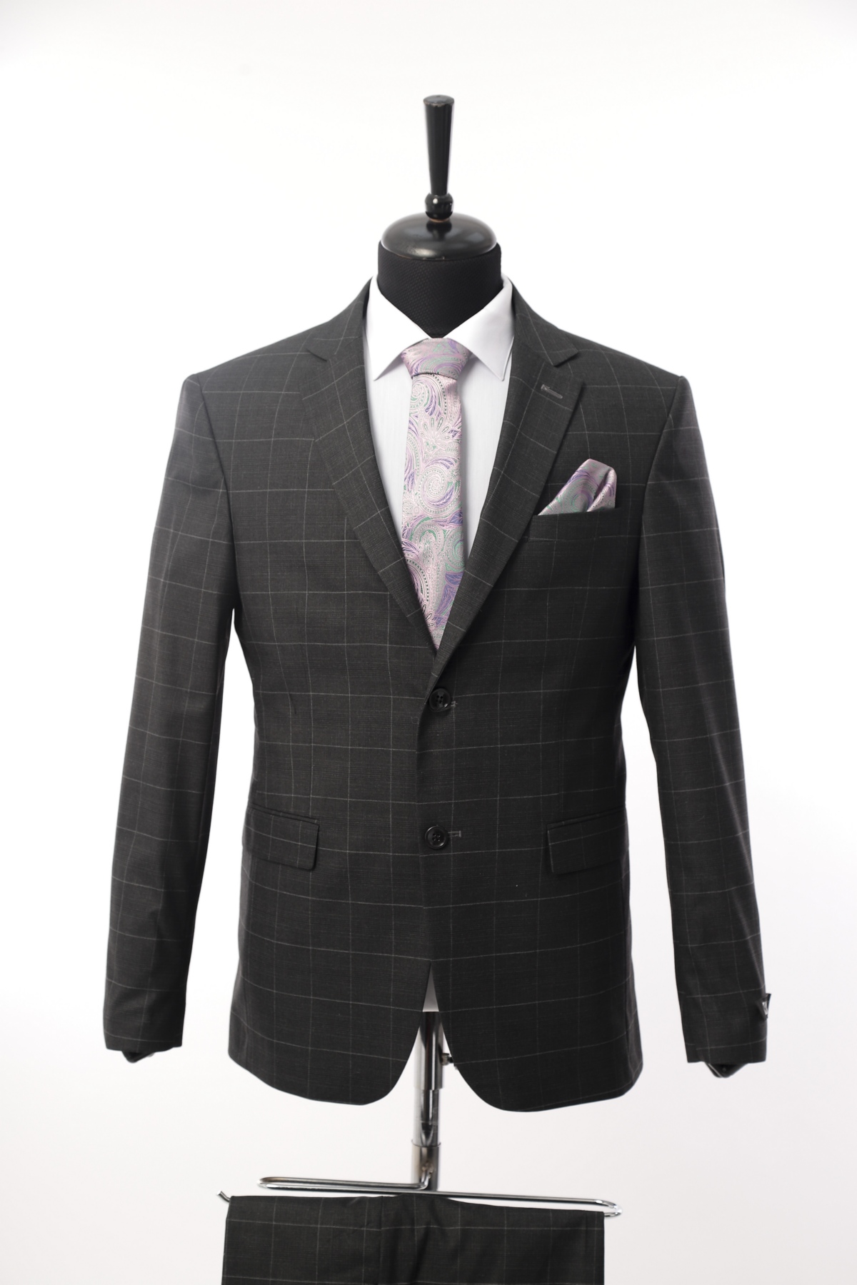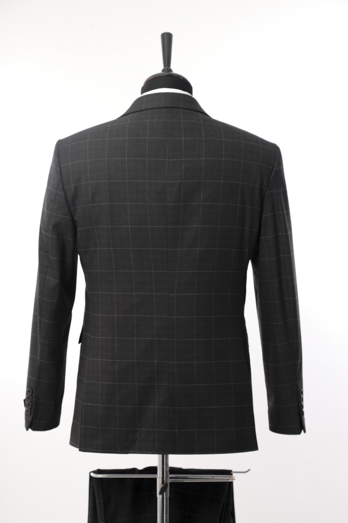 Wool fabric , slim fit suit. Classic cut pants and suit jacket with two flap pockets and one inserted chest pocket. Two button closure and two slits in back.