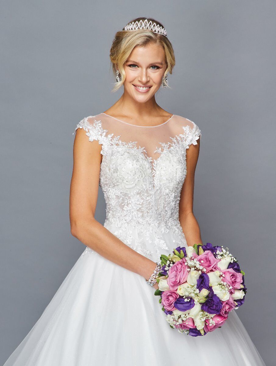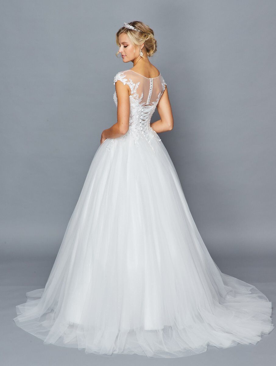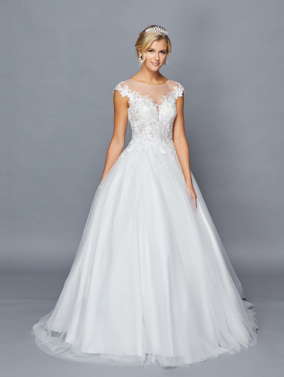 ILLUSION BOAT NECKLINE AND CAP SLEEVE A-LINE COURT TRAIN WEDDING DRESS WITH LACE AND SEQUINS APPLIQUE.