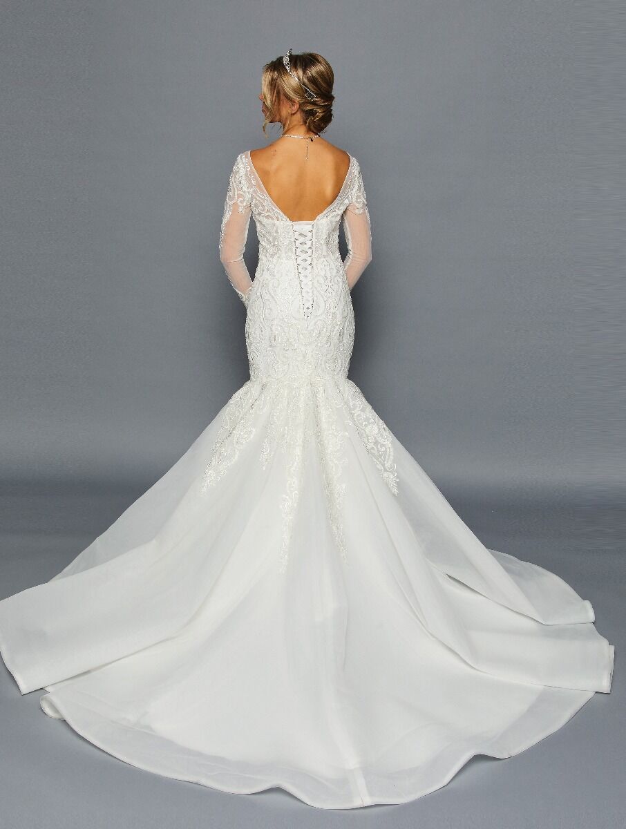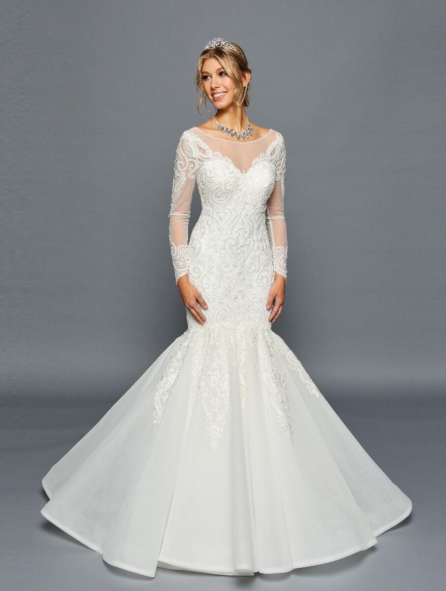 ILLUSION BOAT NECKLINE LONG SLEEVE CLASSIC MERMAID COURT TRAIN WEDDING DRESS WITH BEADED LACE APPLIQUE.