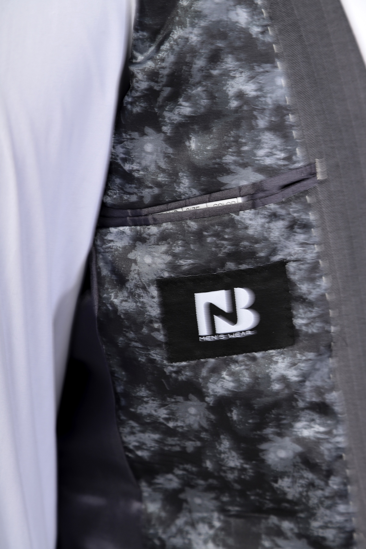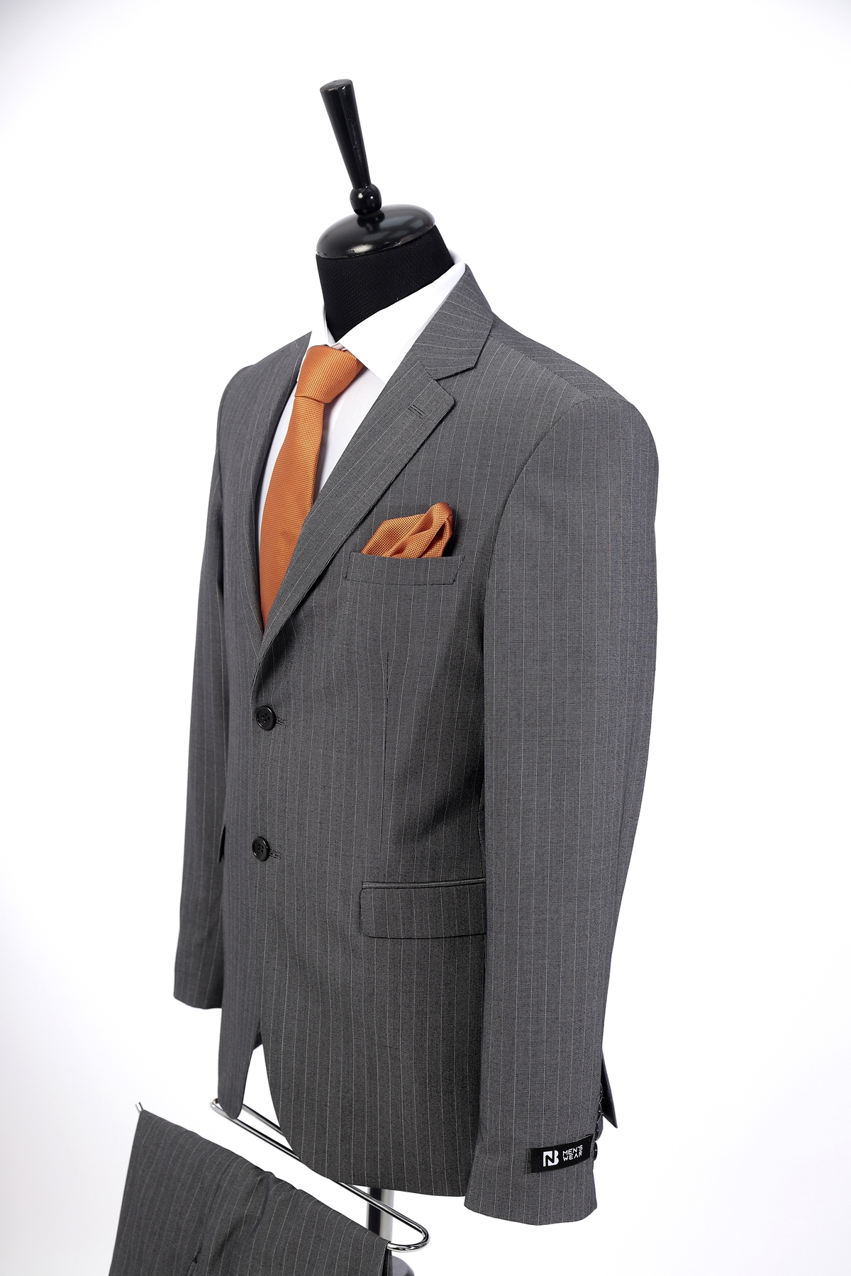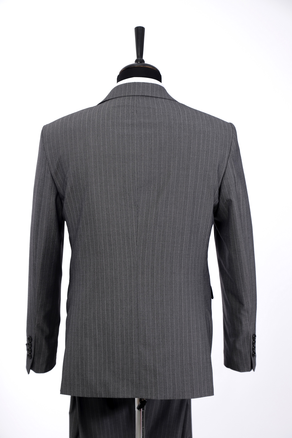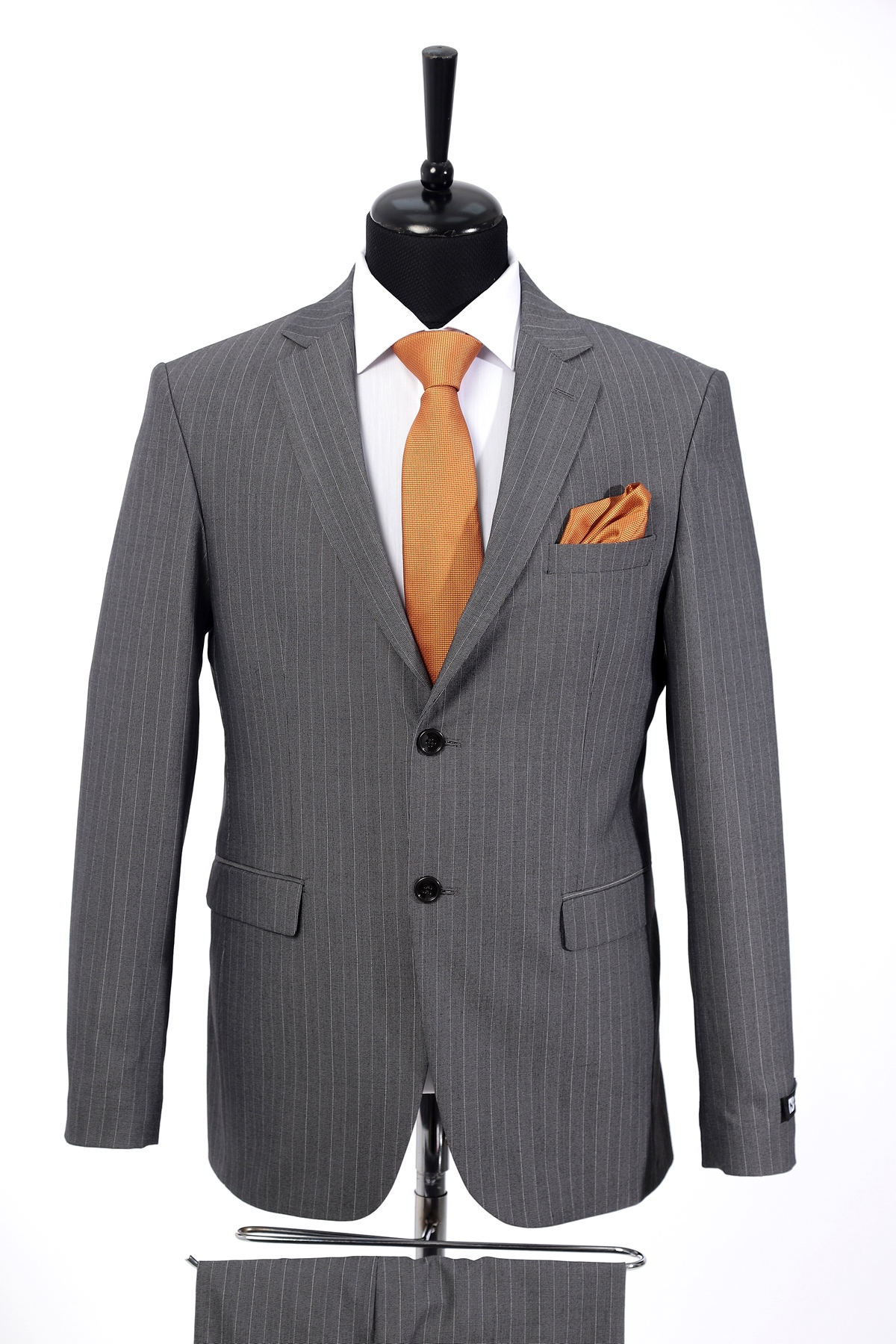 Light Grey, wool, slim fit suit. Classic cut pants and suit jacket with two flap pockets and one inserted chest pocket. Two button closure and two slits in back.