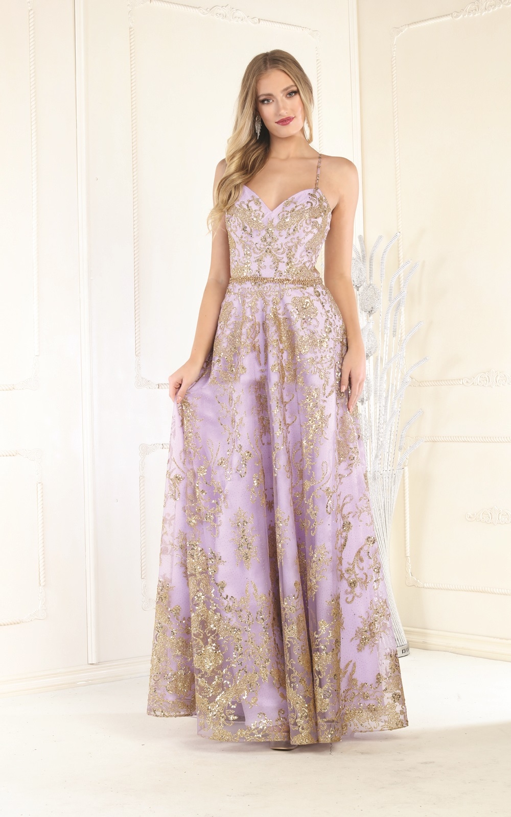 Lilac Gold Low-cut, Shiny Patterned Long Dress