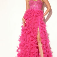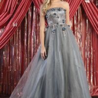 Dazzling custom embellishment throughout the fitted bodice gives this modest evening gown just enough sparkle to shine on any occasion.