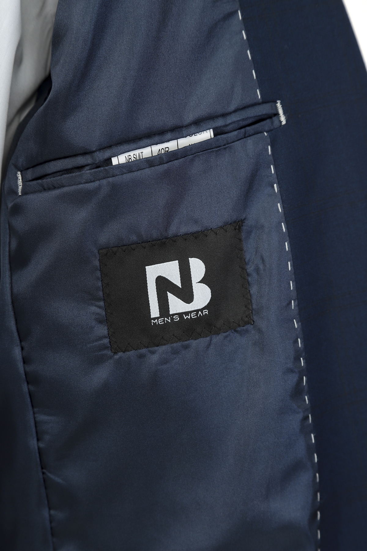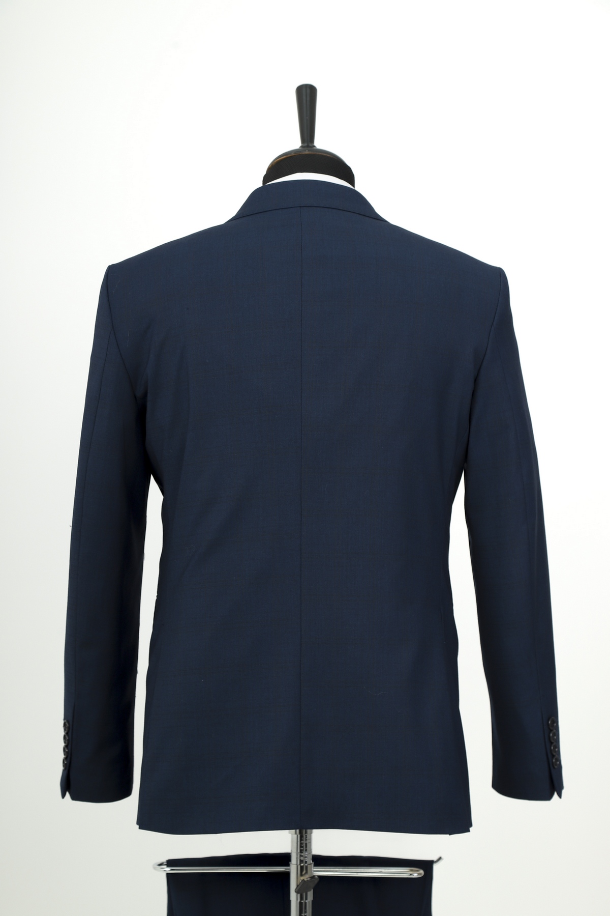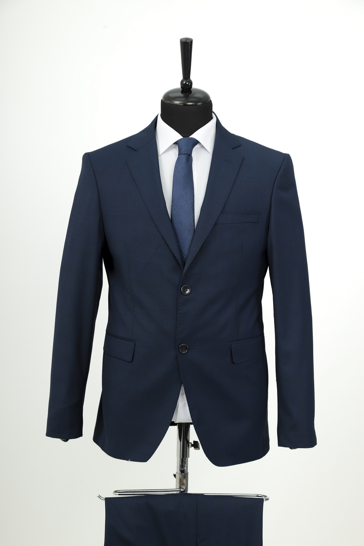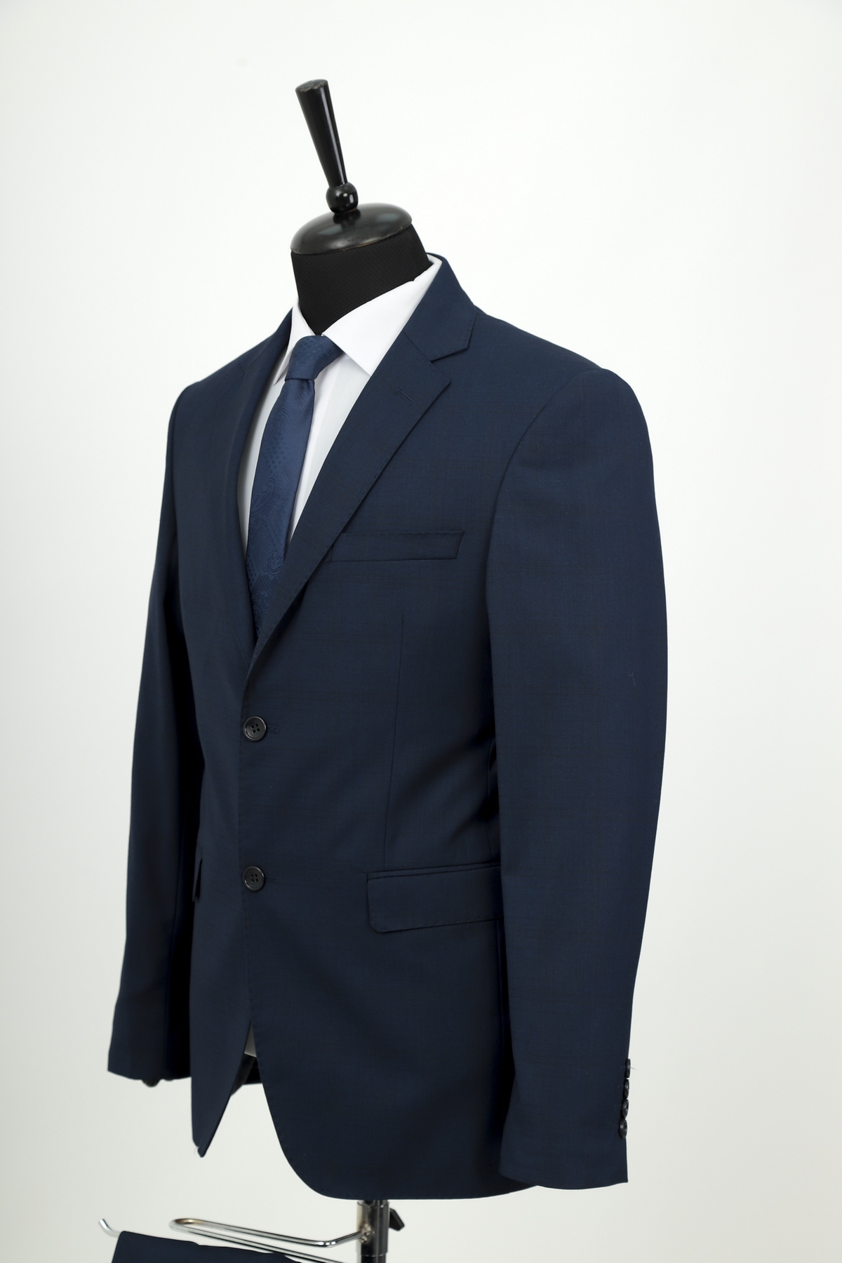 Wool fabric , slim fit suit. Classic cut pants and suit jacket with two flap pockets and one inserted chest pocket. Two button closure and two slits in back.
