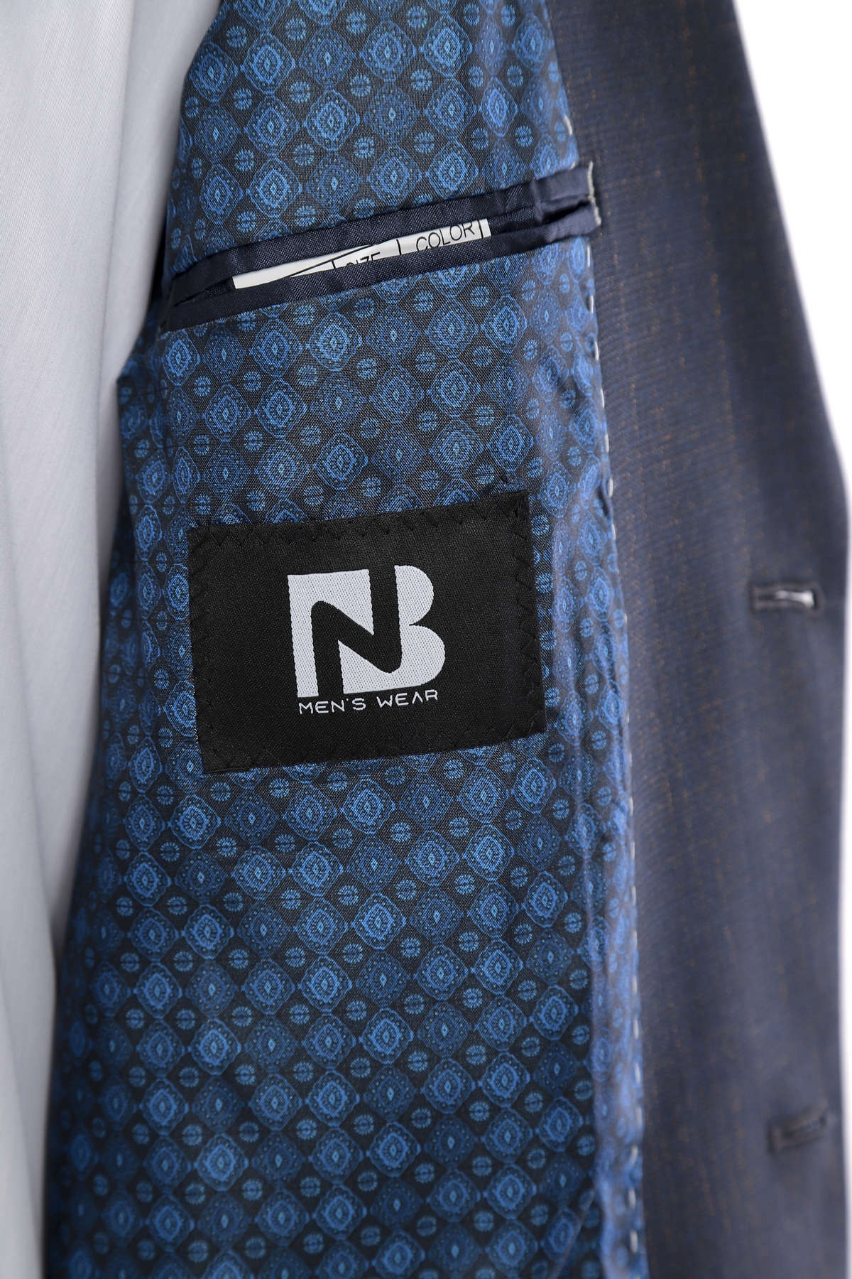Wool fabric , slim fit suit. Classic cut pants and suit jacket with two flap pockets and one inserted chest pocket. Two button closure and two slits in back.