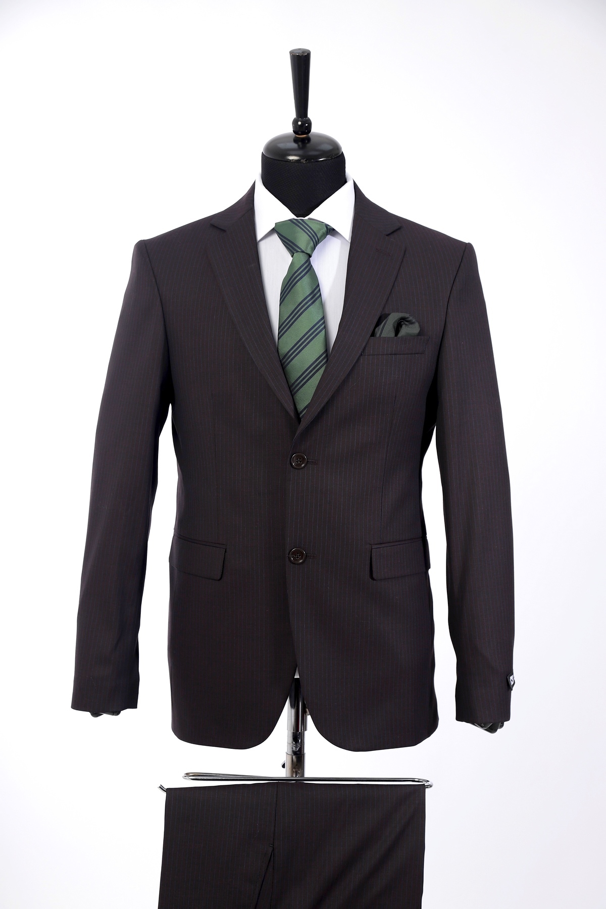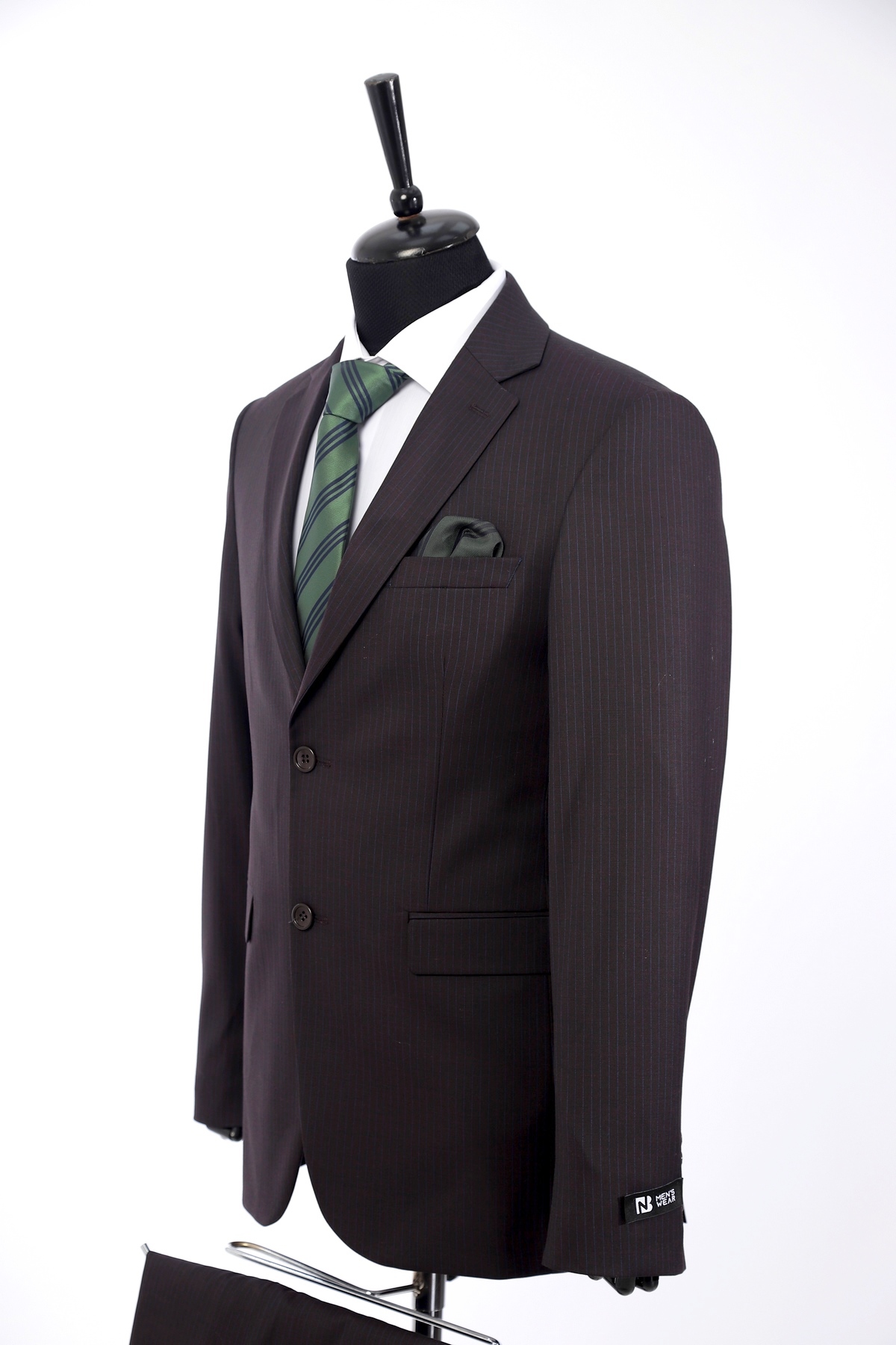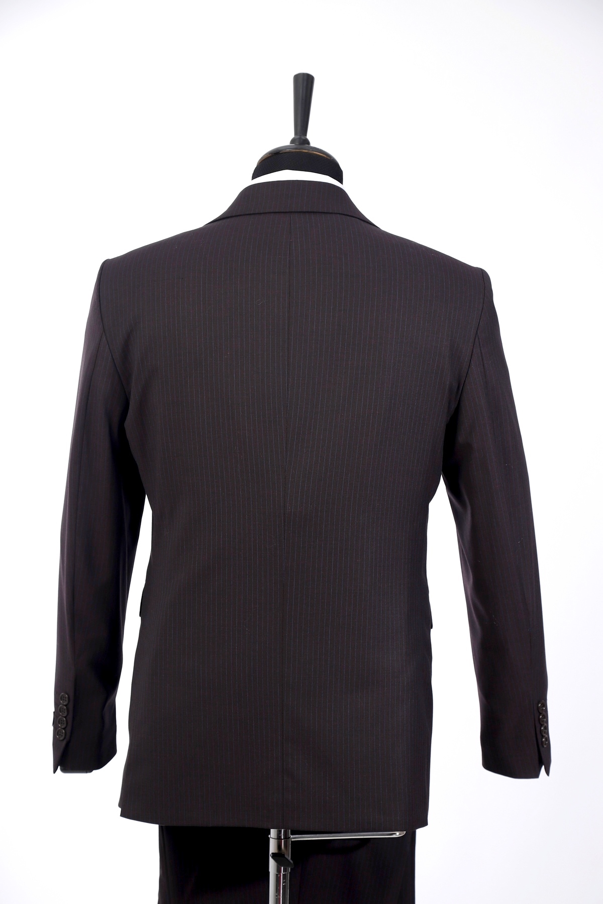 Navy , wool, slim fit suit. Classic cut pants and suit jacket with two flap pockets and one inserted chest pocket. Two button closure and two slits in back.