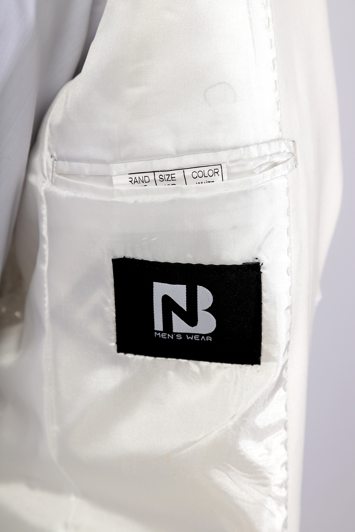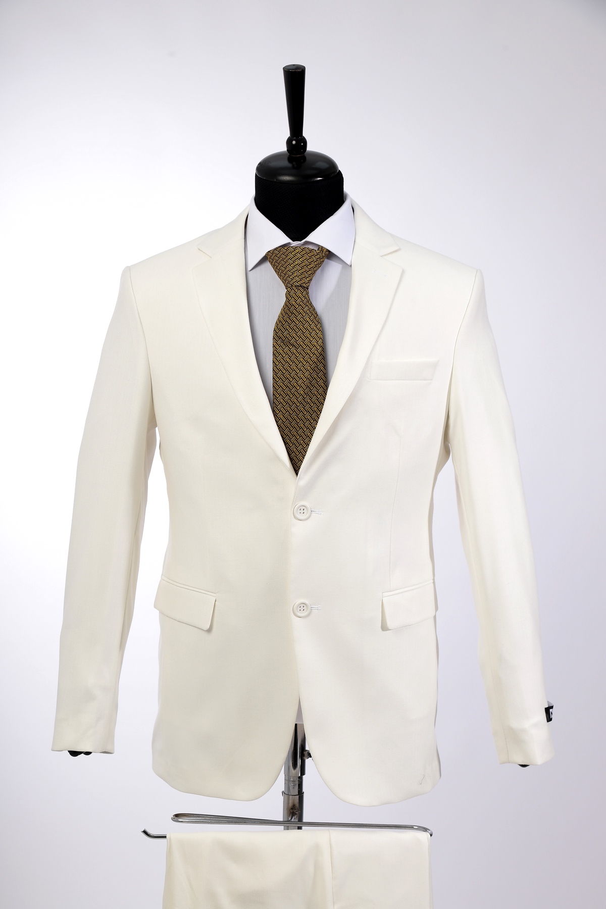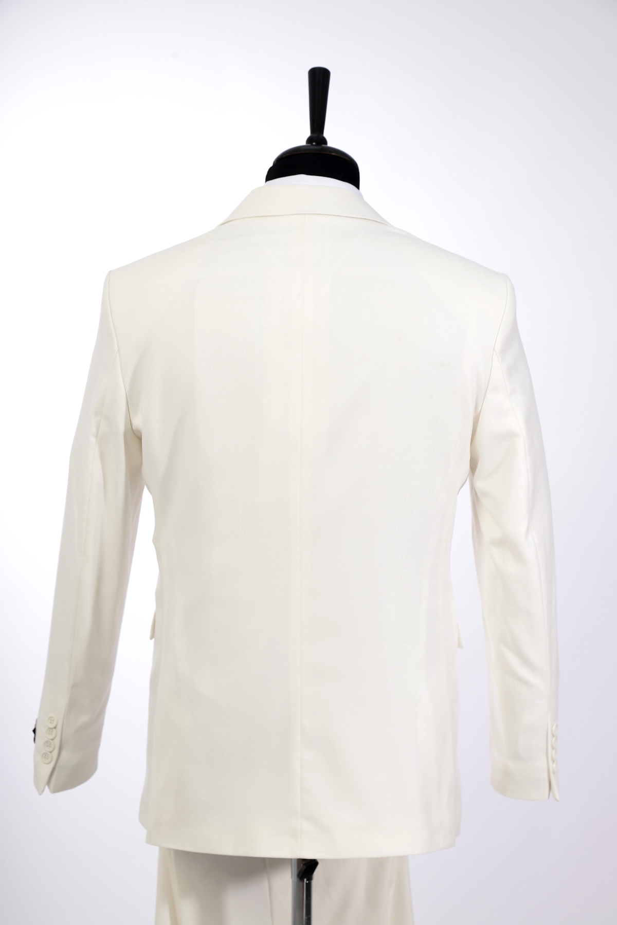 White, wool, slim fit suit. Classic cut pants and suit jacket with two flap pockets and one inserted chest pocket. Two button closure and two slits in back.