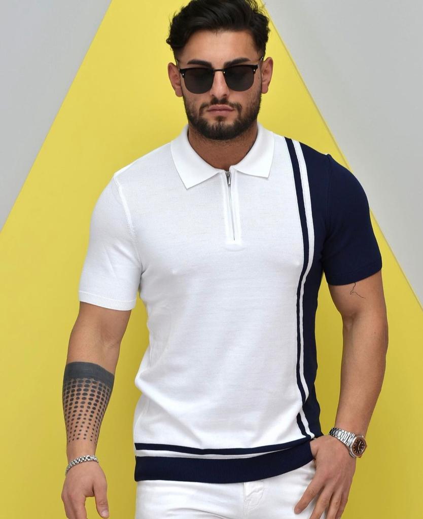Polo Neck Half Zipper White Navy Knitted Fabric T-Shirt