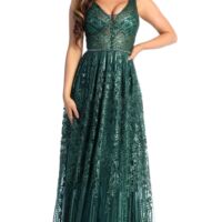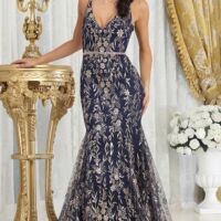 Dazzling custom embellishment throughout the fitted bodice gives this modest evening gown just enough sparkle to shine on any occasion.