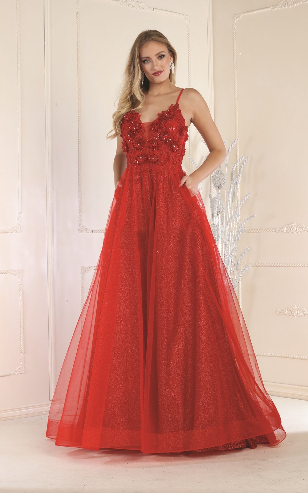 Red Wedding Dress Style Long Dress with Shoulder Strap Tulle Density