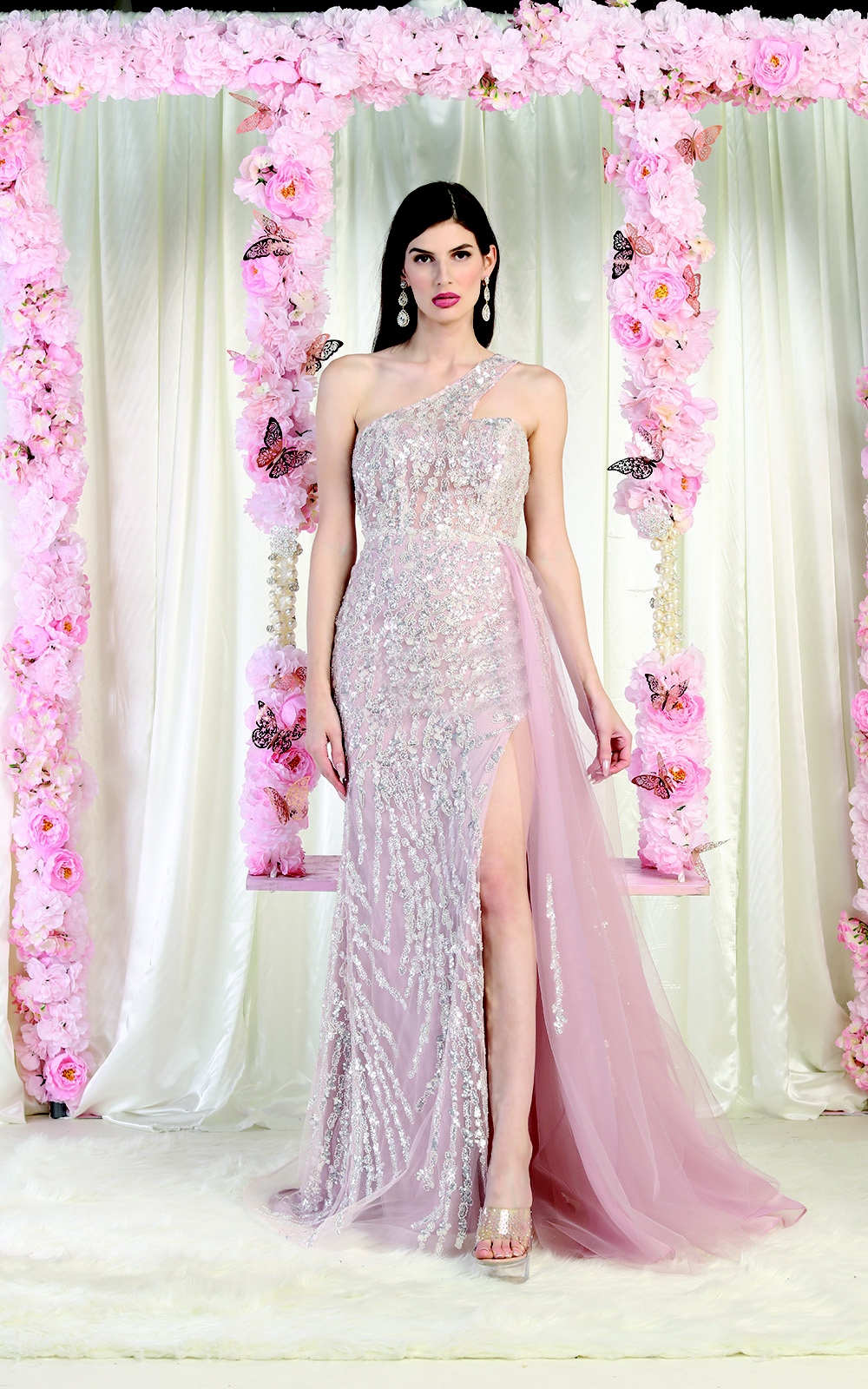 Dazzling custom embellishment throughout the fitted bodice gives this modest evening gown just enough sparkle to shine on any occasion.