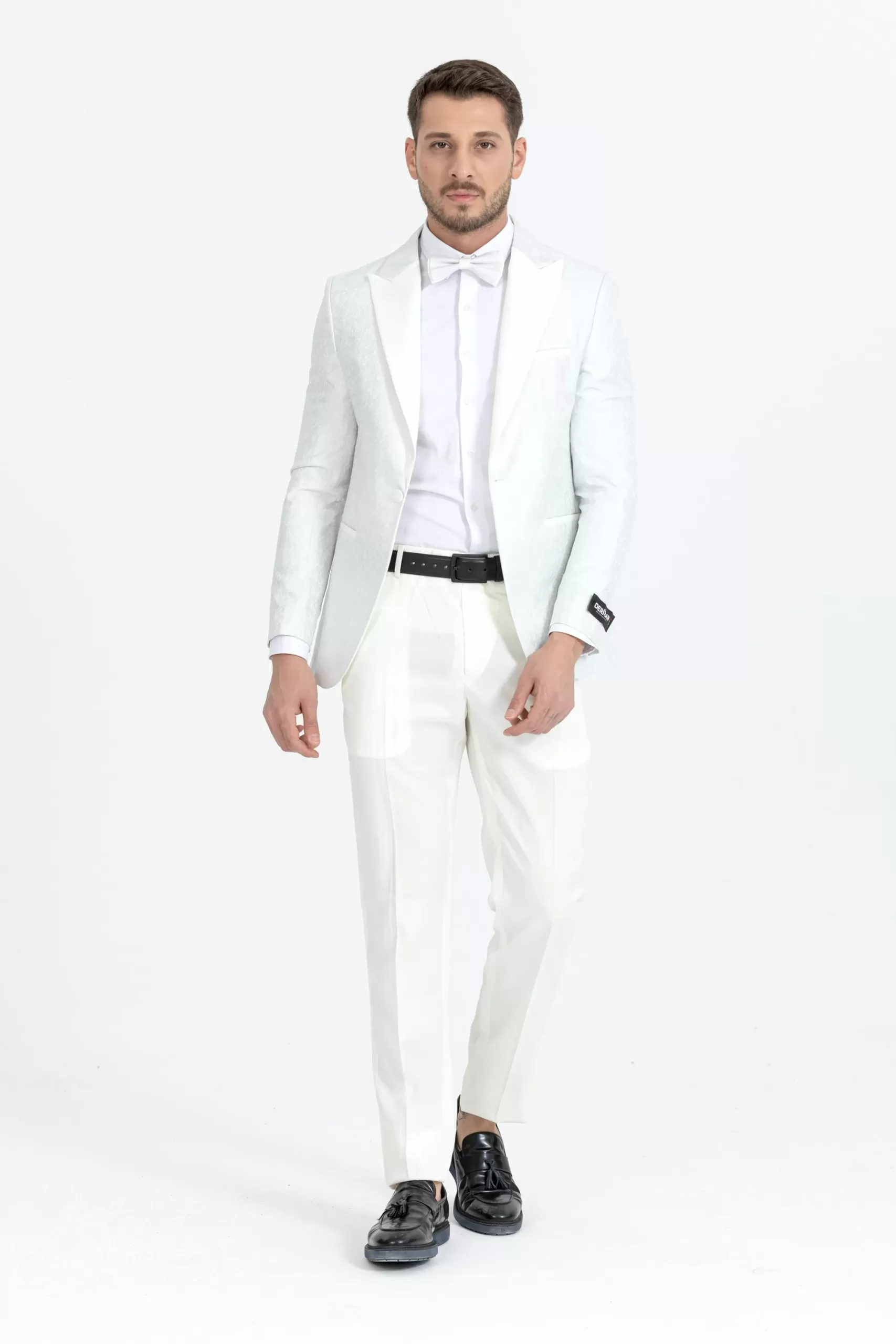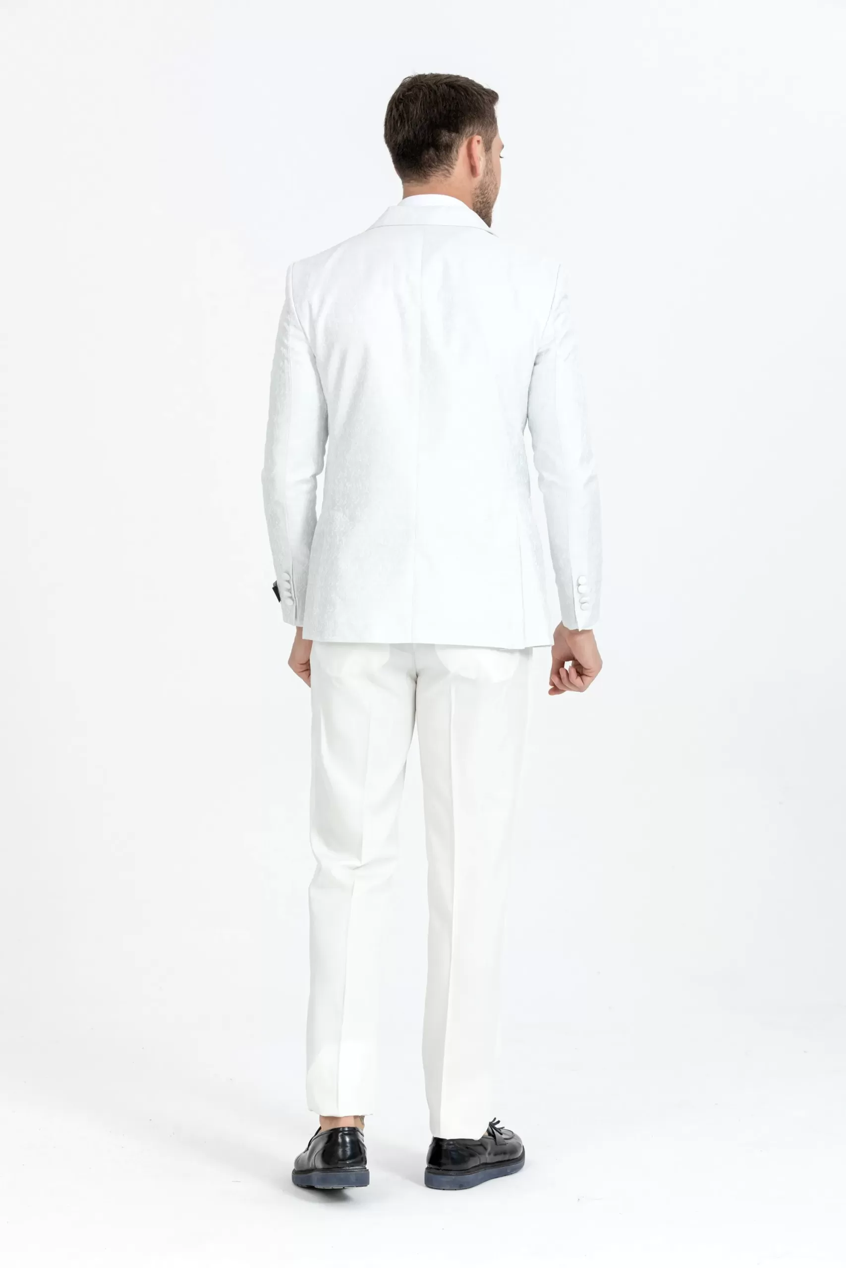 White Floral Patterned Textured Tuxedo Two Piece Set