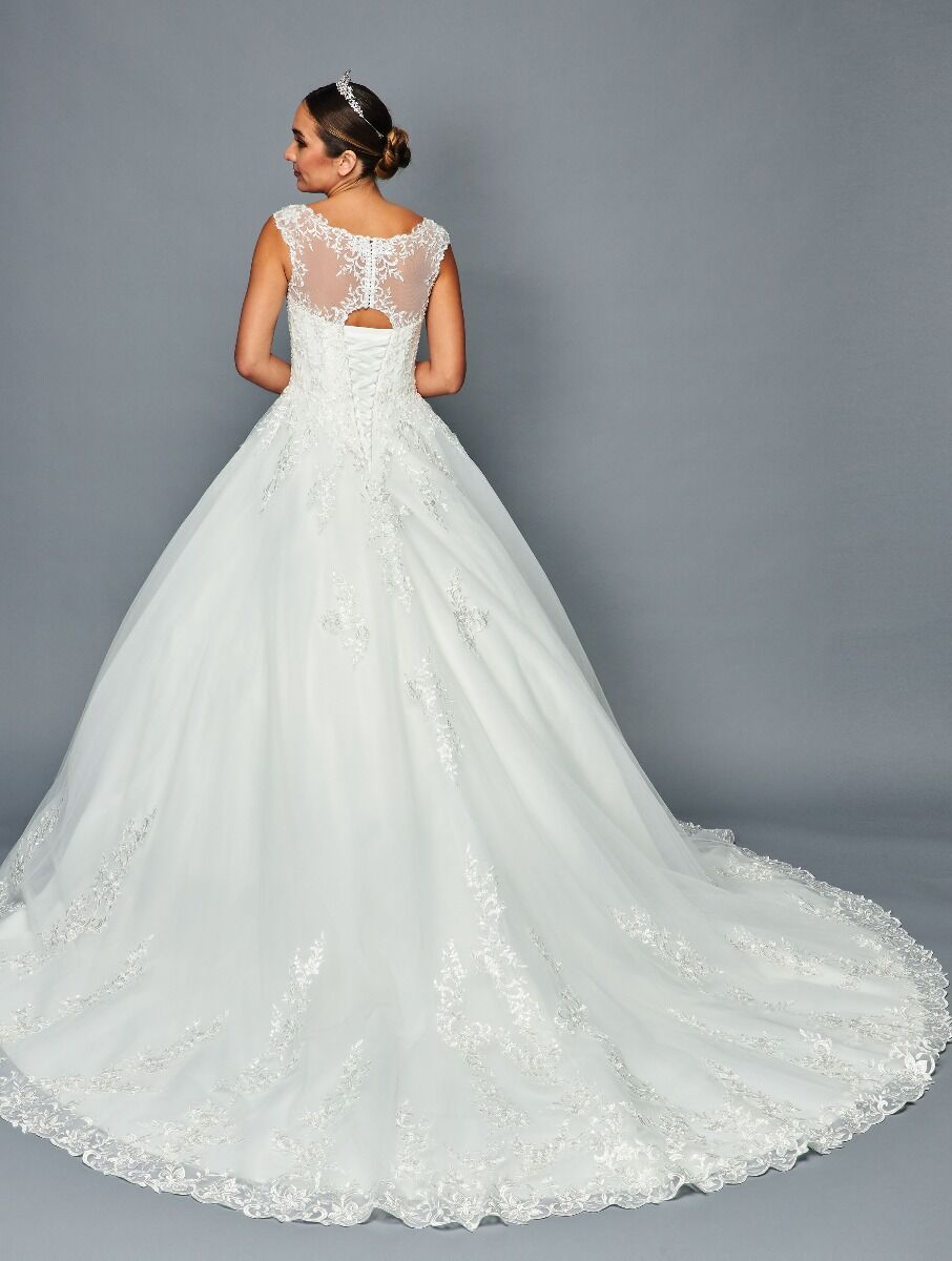 Wide Boat Neckline Cap Sleeve A-Line Chapel Train Wedding Dress